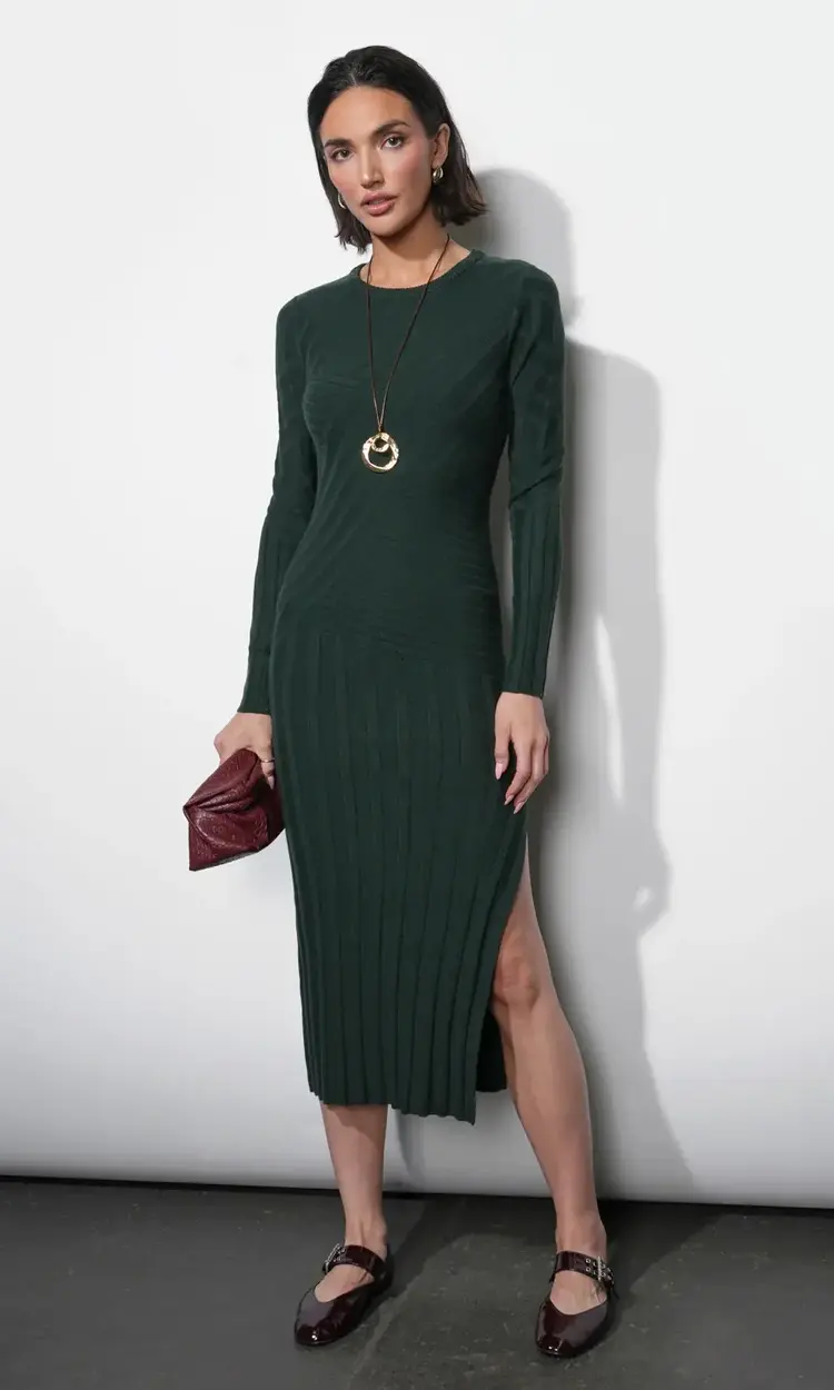 This midi-length dress is crafted from a soft, stretchable ribbed knit fabric. The key detail is the intentional "paneled" construction, which uses varying rib directions or seamless joins to subtly contour the body and add textural interest.