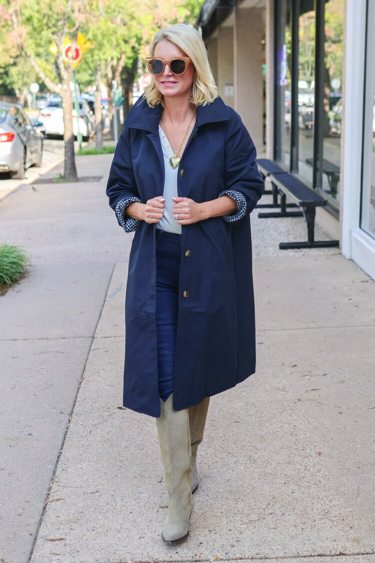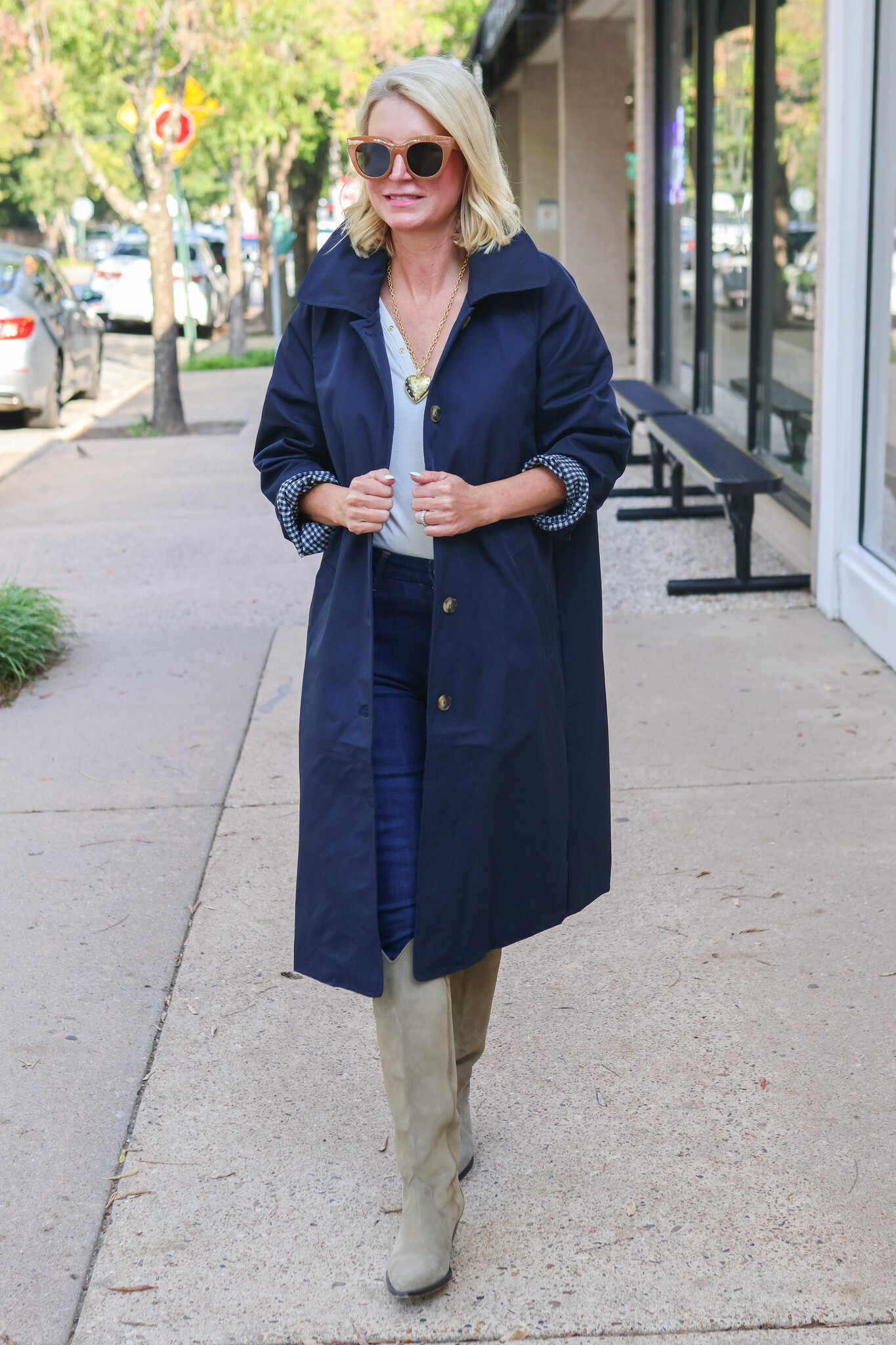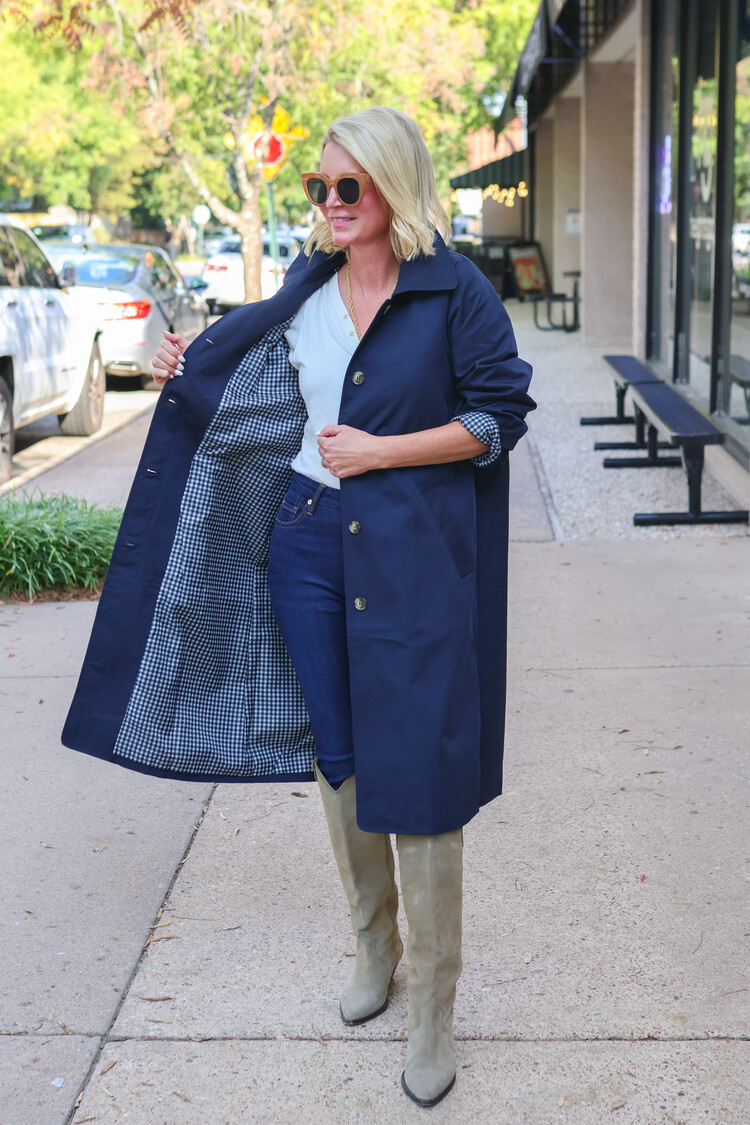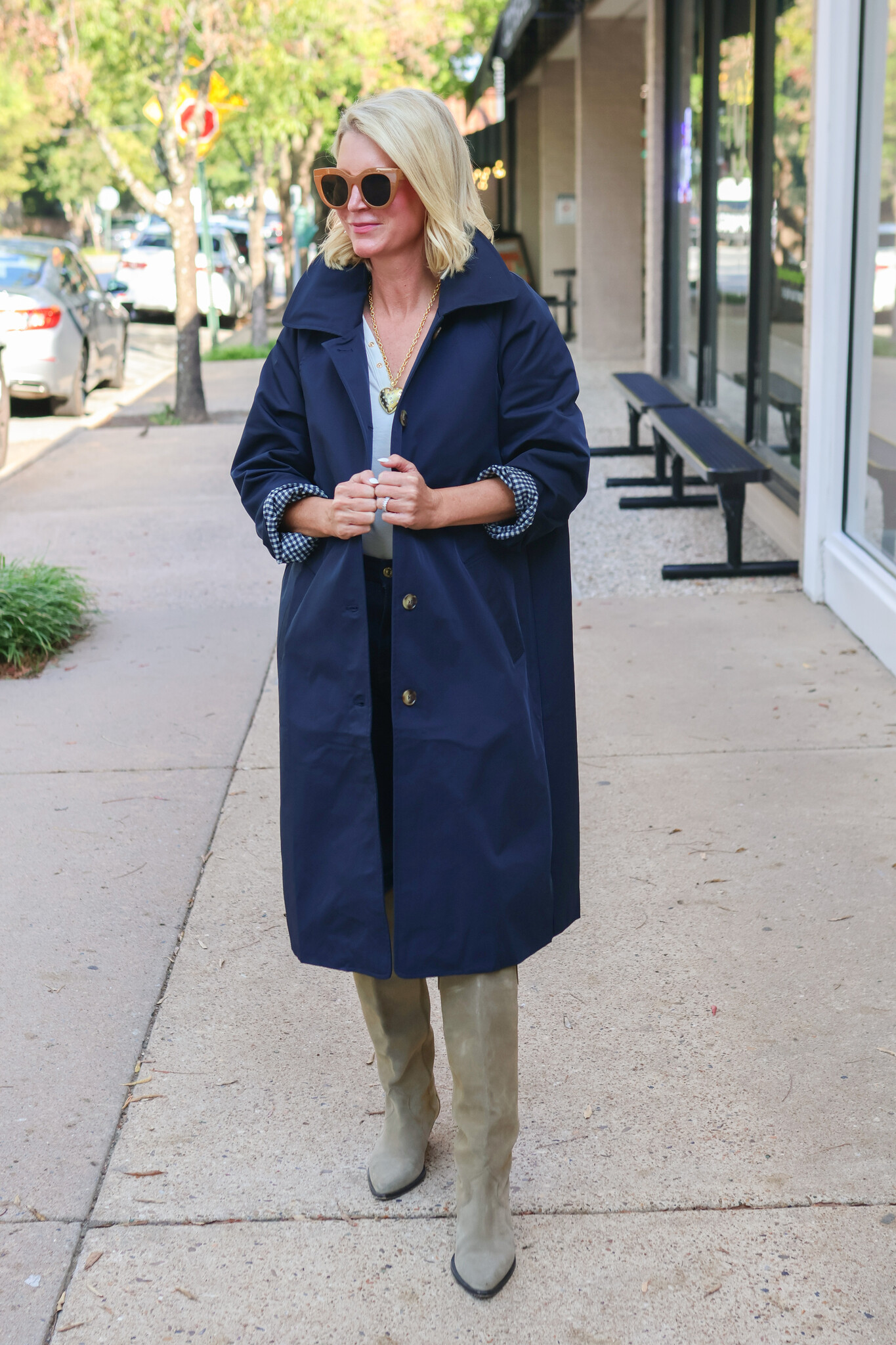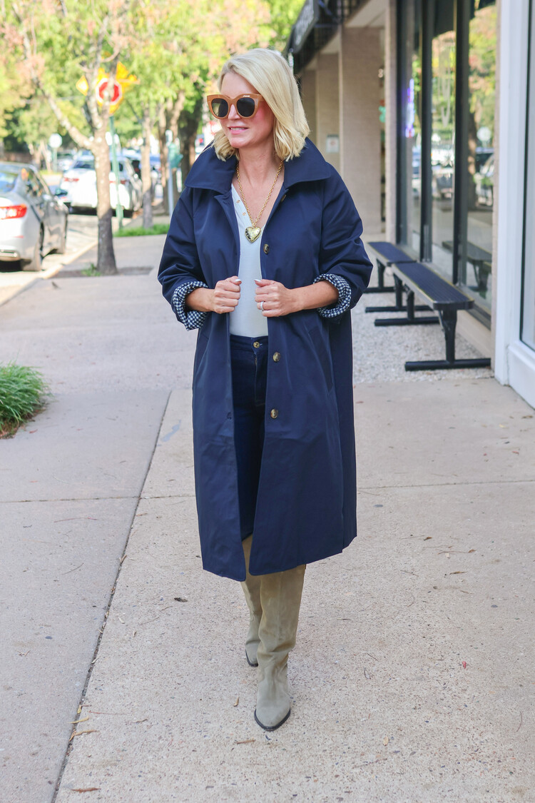 • A longline trench-style coat featuring a spread collar, front button closures, and welt pockets. Designed in a relaxed straight silhouette with a clean, polished finish.