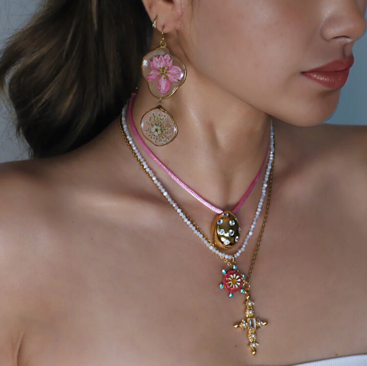 Handmade charm with enamel daisy and crystals. Hand painted, faceted rainbow moonstone beads. Approx. 13” with 4” extension chain. Handmade with ♥ in Los Angeles, CA.