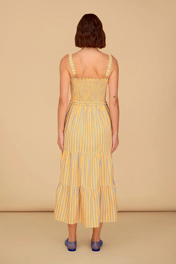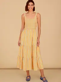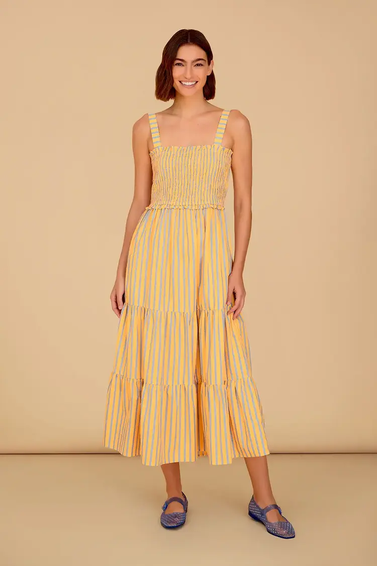 A sweet and simple style, the Milly Dress is a go-to for when you want to look elevated and put together while still feeling comfortable. This day to night style features a smocked bodice, adjustable thick straps, and a tiered midi skirt.