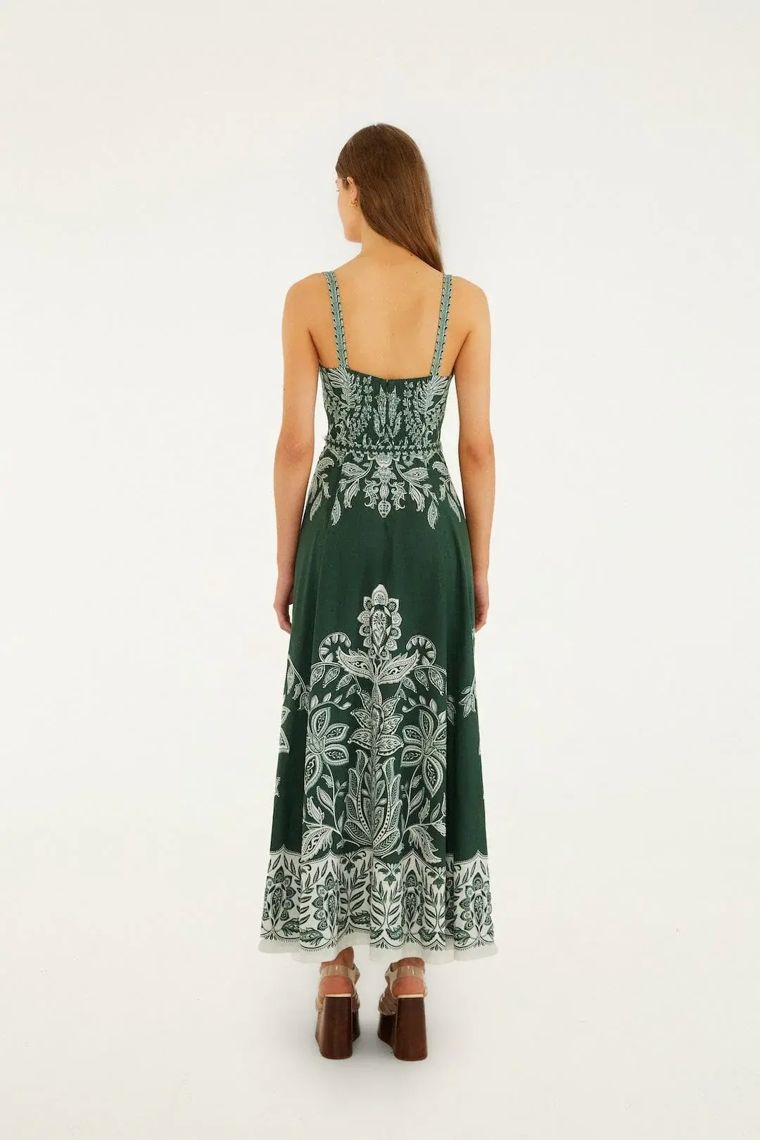 • Crafted from breathable linen, it features a flattering sweetheart neckline that softly frames the décolletage. The rich, deep green hue gently contrasts with playful buckle details along the straps, adding a touch of whimsy.