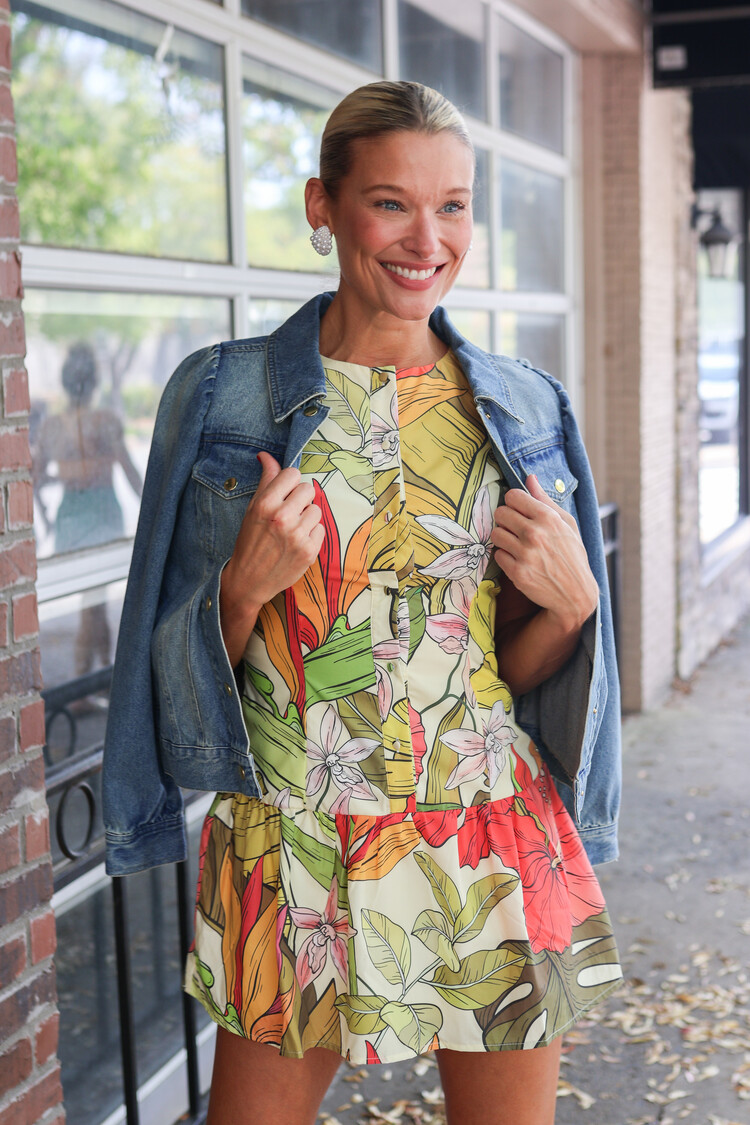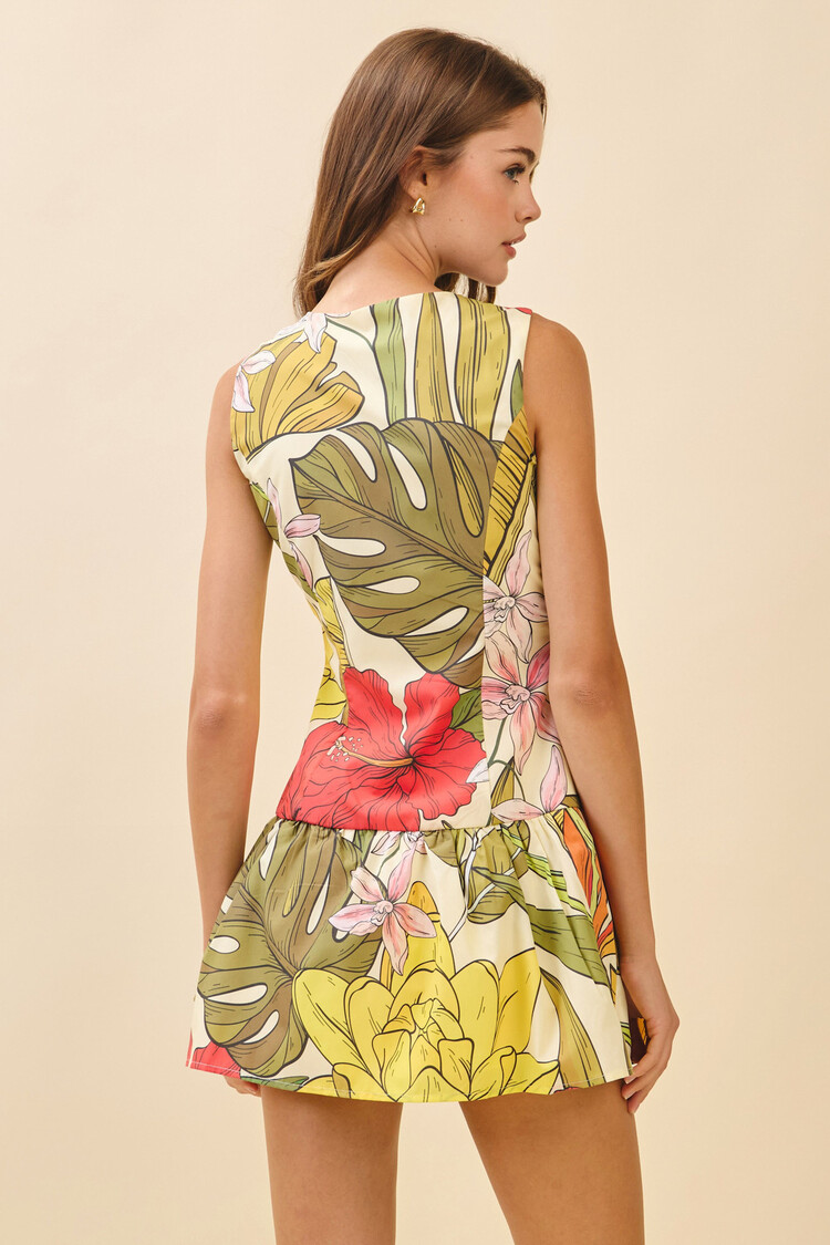 • A tropical floral print mini dress featuring a fitted bodice and flared drop-waist skirt for a playful silhouette. Finished with a covered button-down front. 80% Polyester, 20% Cotton