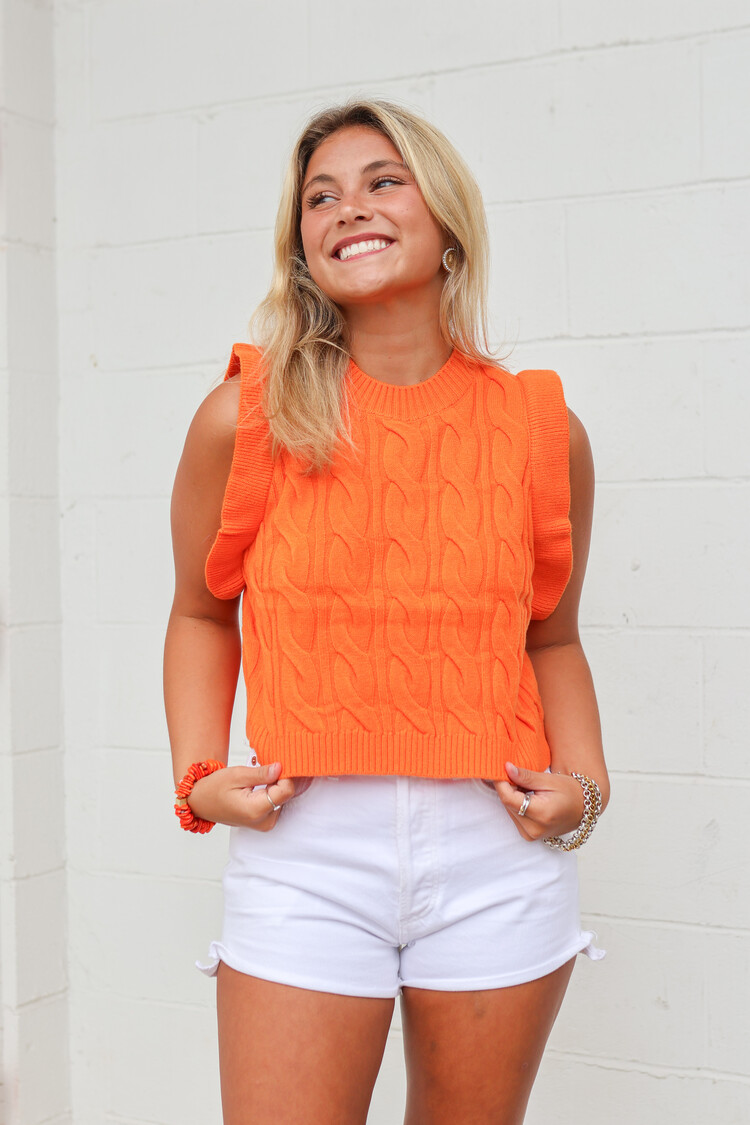 • Introducing the must-have spring staple - the Miranda Sweater Vest! Add some flair to your wardrobe with its cable knit design, cropped length, and playful ruffled detailing. 50% Acrylic, 28% Polyester, 22% Nylon