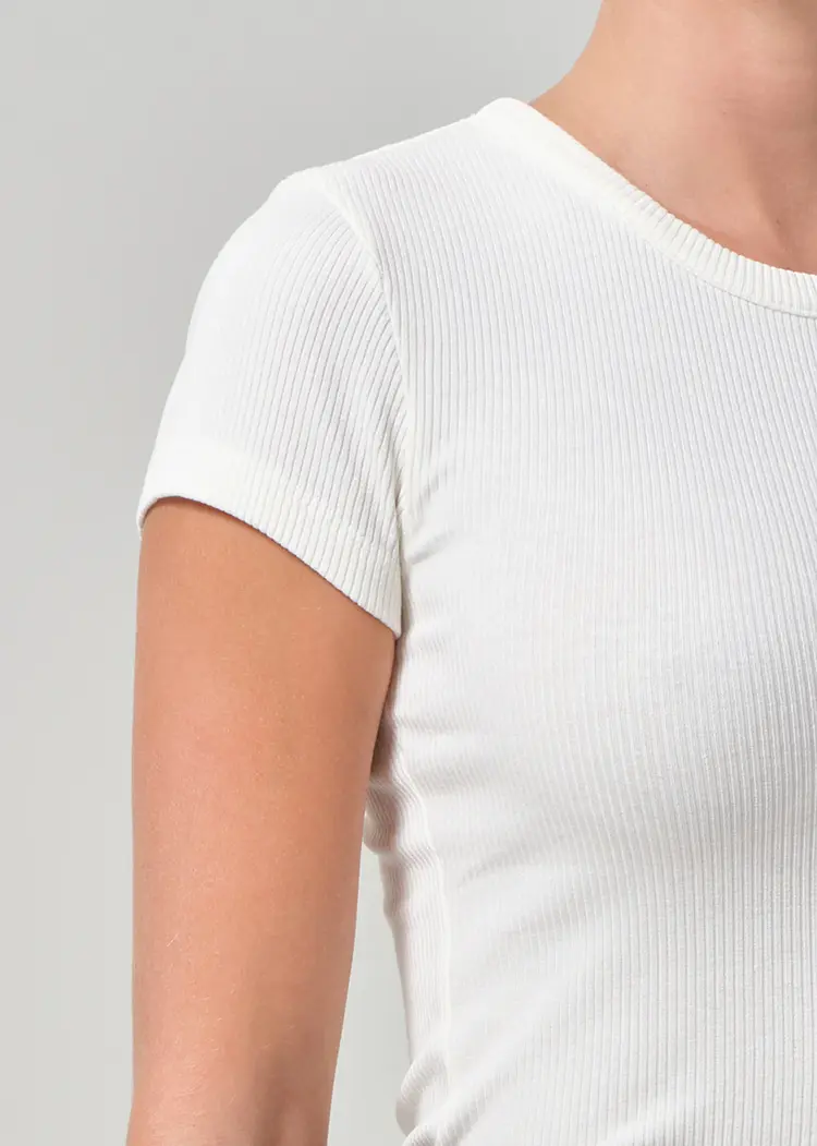 Your go-to base for whatever the day demands. Designed in a plush, ultra-soft rib knit that moves with you, it balances structure with softness. A precise fit, clean neckline, and short sleeves make it a polished piece for layering or leading on its own.