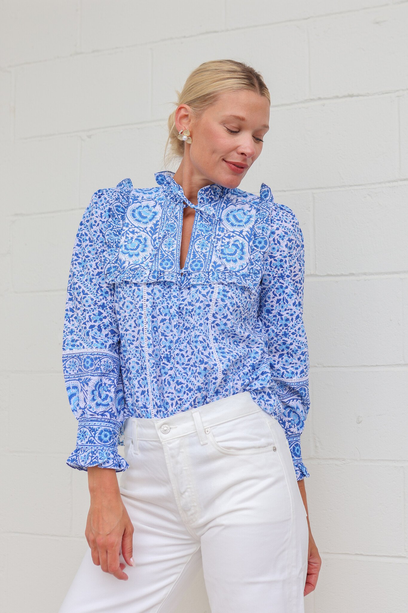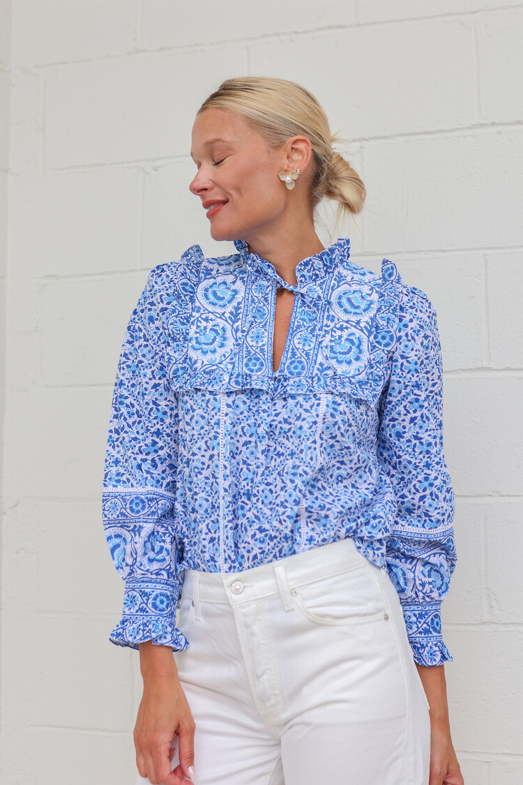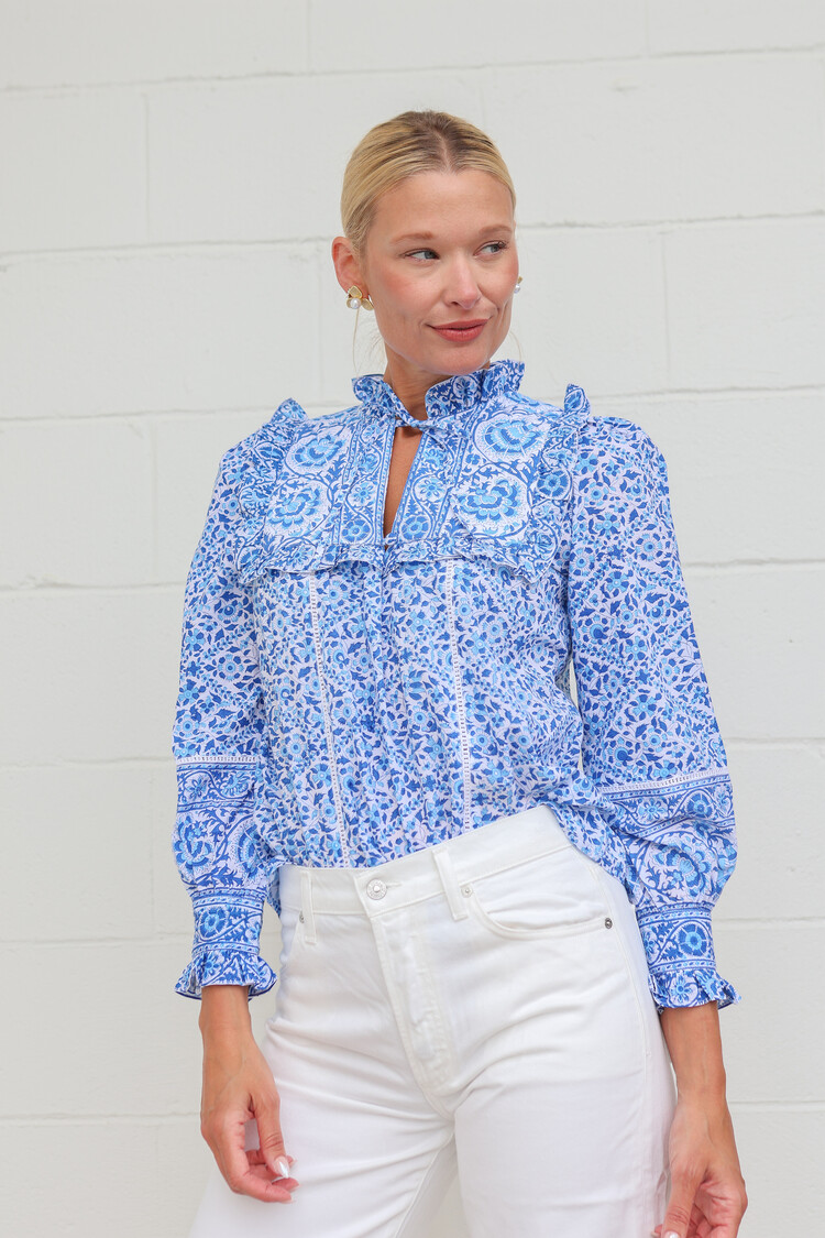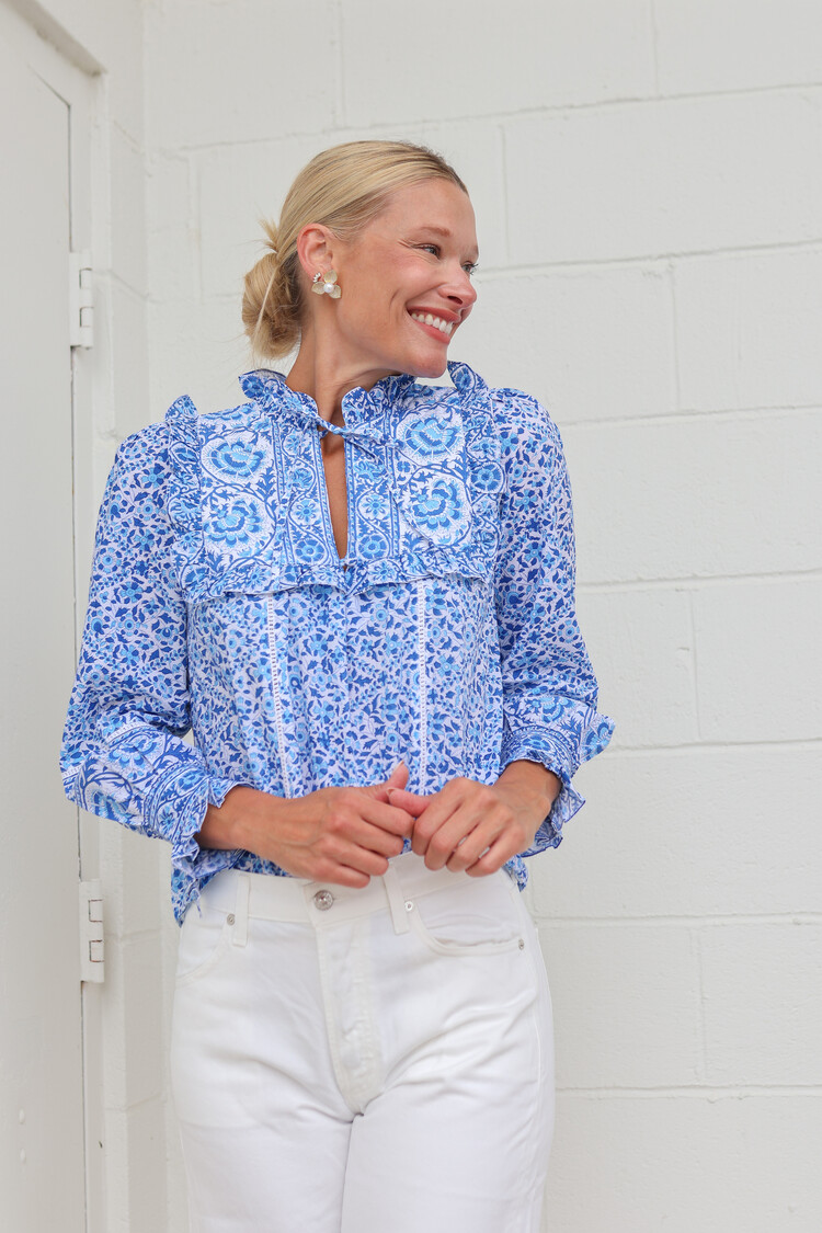 Block-printed by hand in a mix of vintage-inspired block-prints in rich shades of blue.. We love the trellis-print yoke finished with a border ruffle. Lace inserts throughout the blouse add a feminine touch, complete with a pretty bow tie at the neckline.