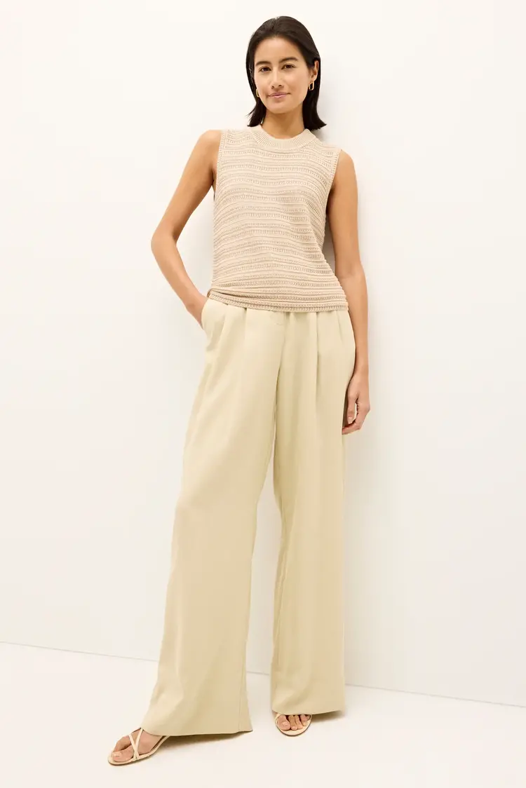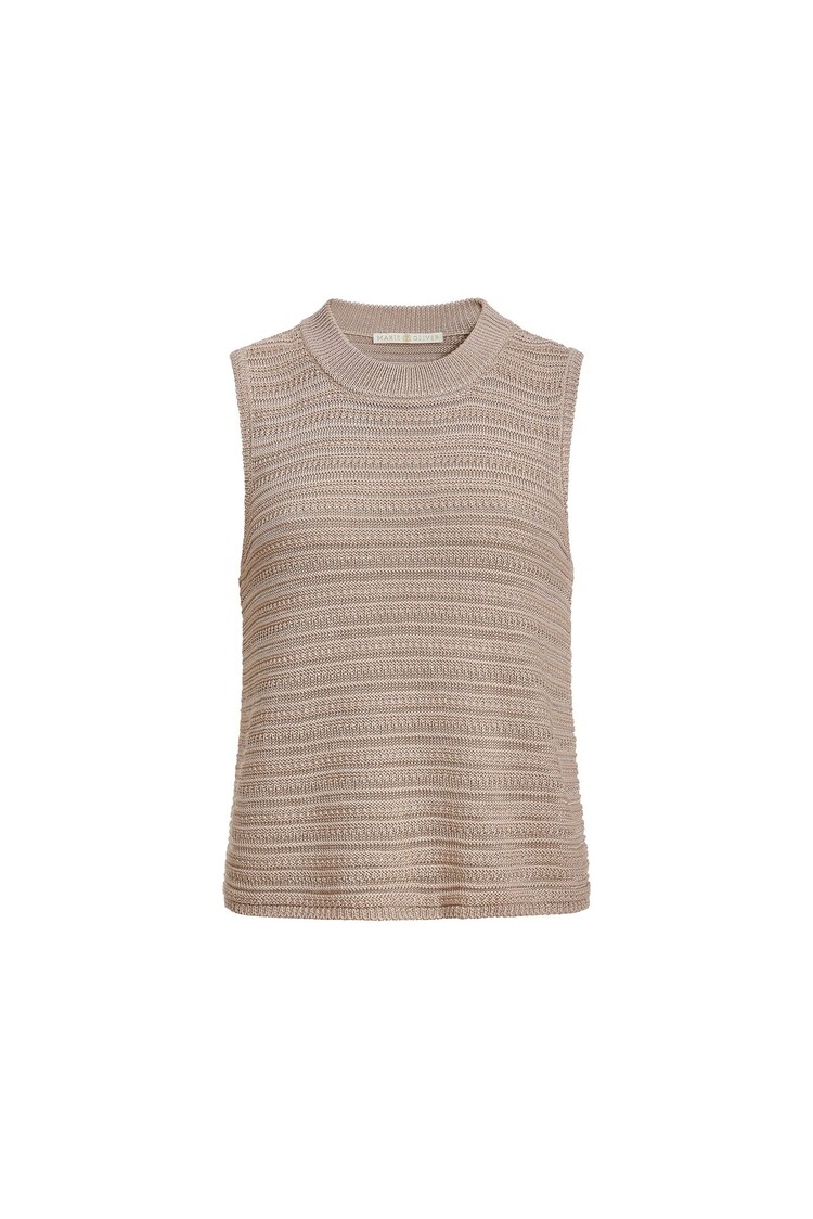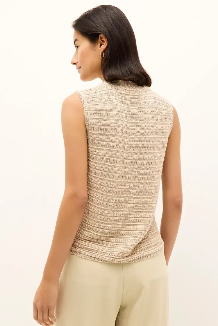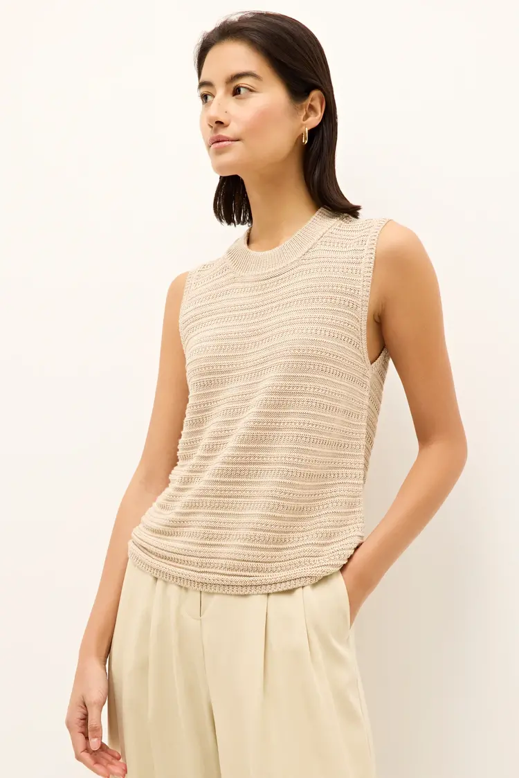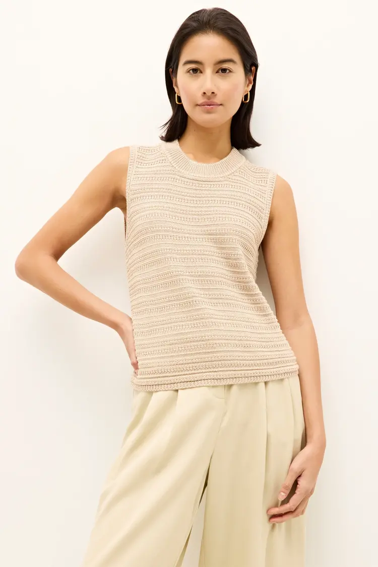 • This slinky knit shell in horizontal rib knit can be worn loose or tucked in for an understated yet elevated everyday look. With just a hint of shine and calming neutral shade, this classic tank is sure to be a seasonal staple in every wardrobe.