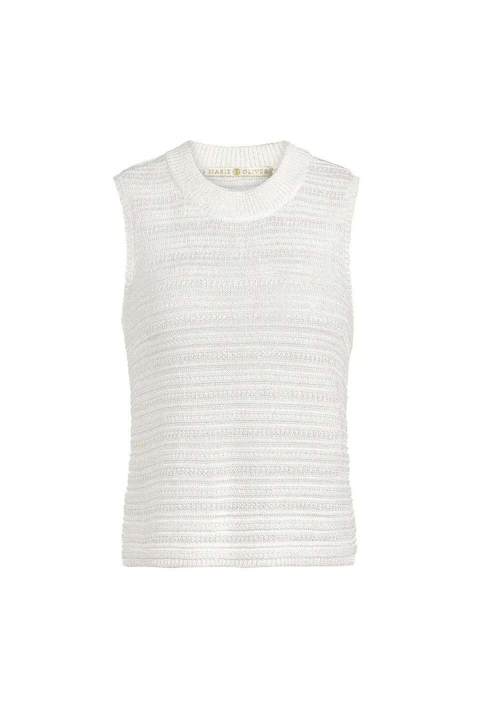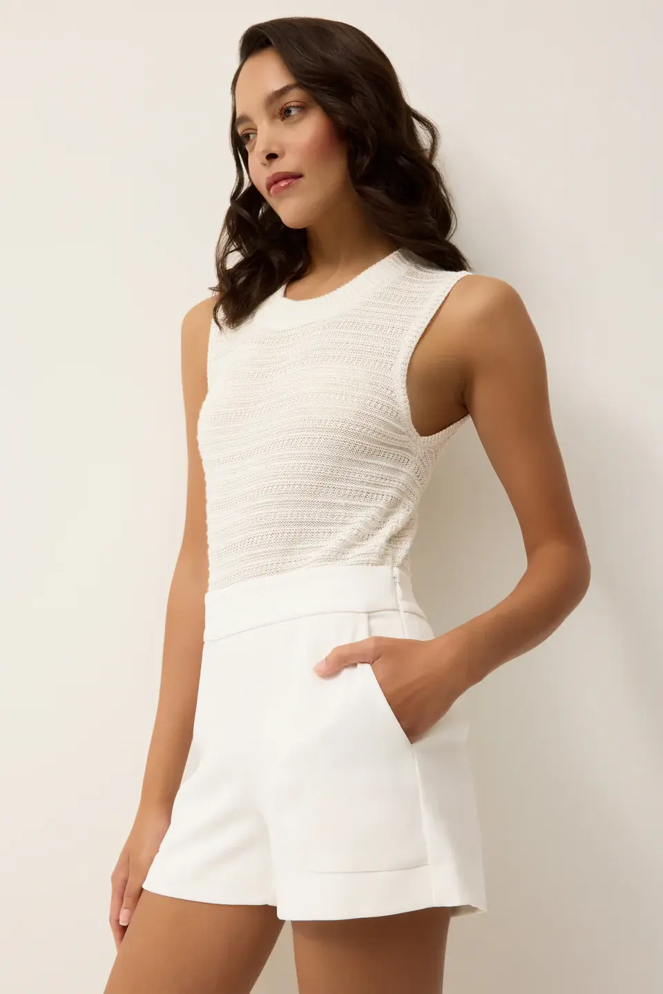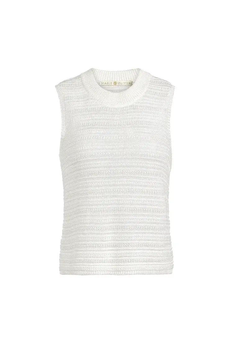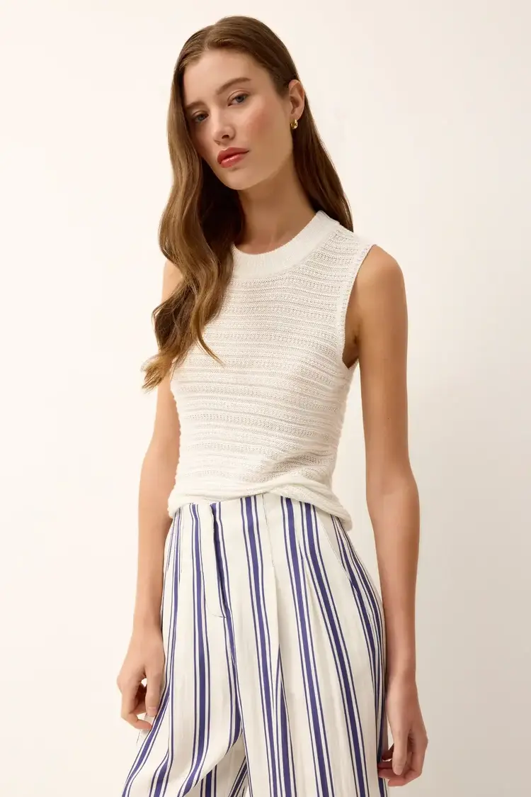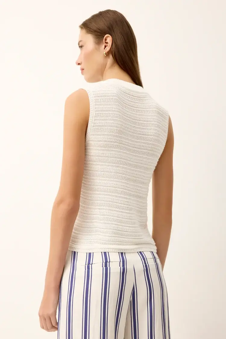 File Nev under elevated warm weather essentials. With its horizontal rib texture and subtle sheen, this slinky knit shell in classic white adds polish to warm-weather dressing. Wear it loose or tucked into a statement skirt for a pulled-together look.