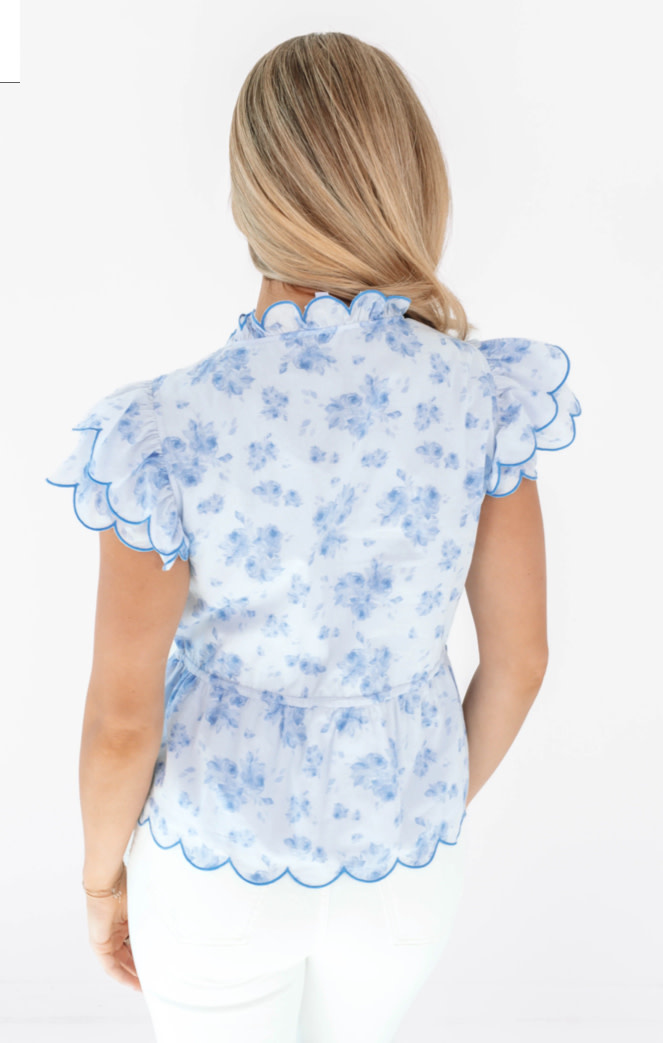 This polished top features a classic blue print accented with delicate scalloped trim for a refined, feminine touch. Designed with a button-up neckline, adjustable tie waist, & flattering peplum silhouette, it blends structure with soft movement.