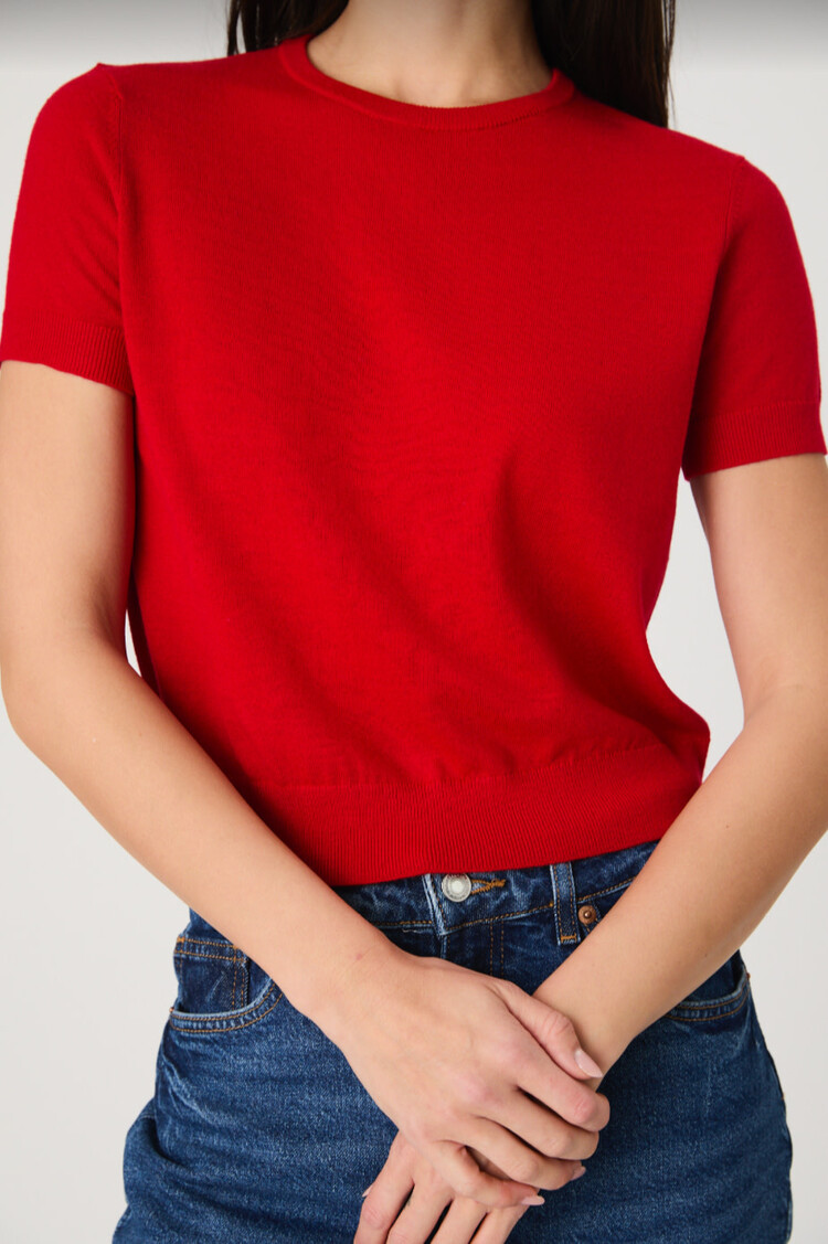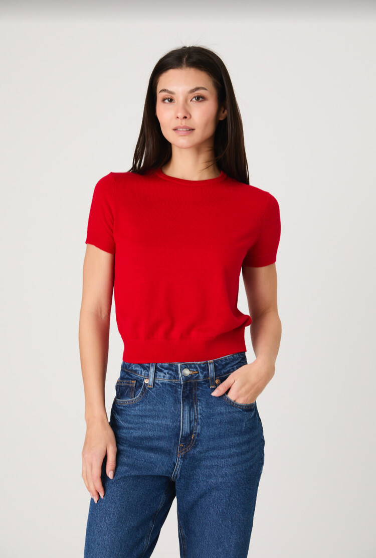 • The Nola Fine Knit Short Sleeve Sweater is a refined staple you’ll reach for again and again. With a smooth jersey knit body and subtle rib trim, it’s soft, lightweight, and polished enough to dress up or down. Simple, versatile, and quietly elevated.
