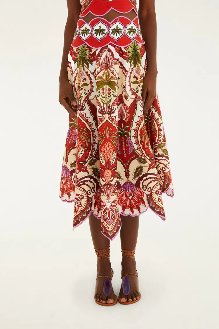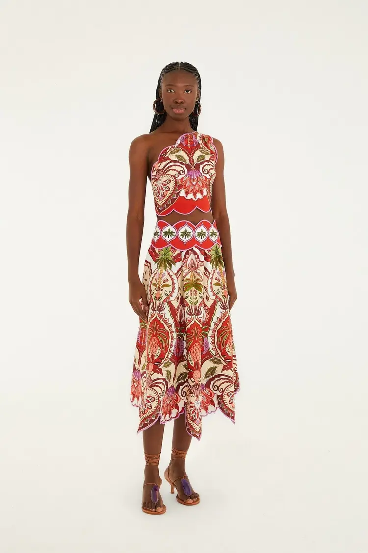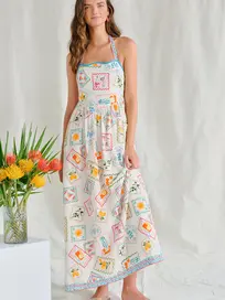 Add this stamp to your collection: our Maysilee maxi dress is cut from a playful stamp printed linen fabric- perfect for a tropical vacation. The halter top and flowing skirt flatter any body type, and the scallop hem along the bust adds delicate appeal.