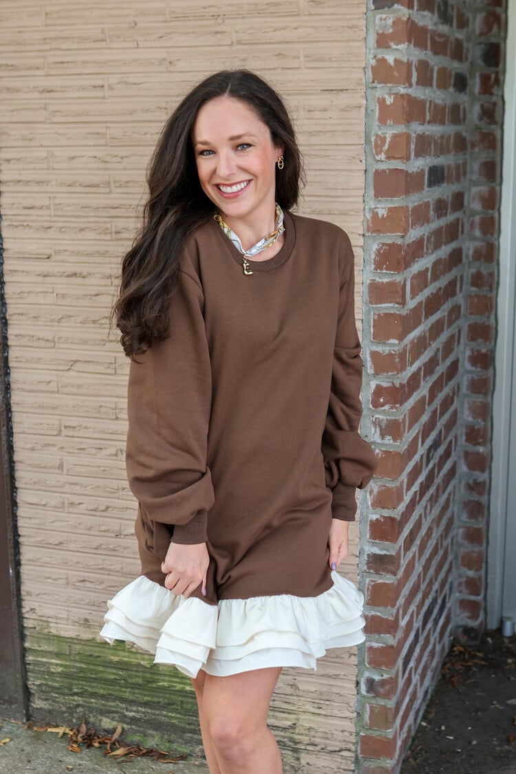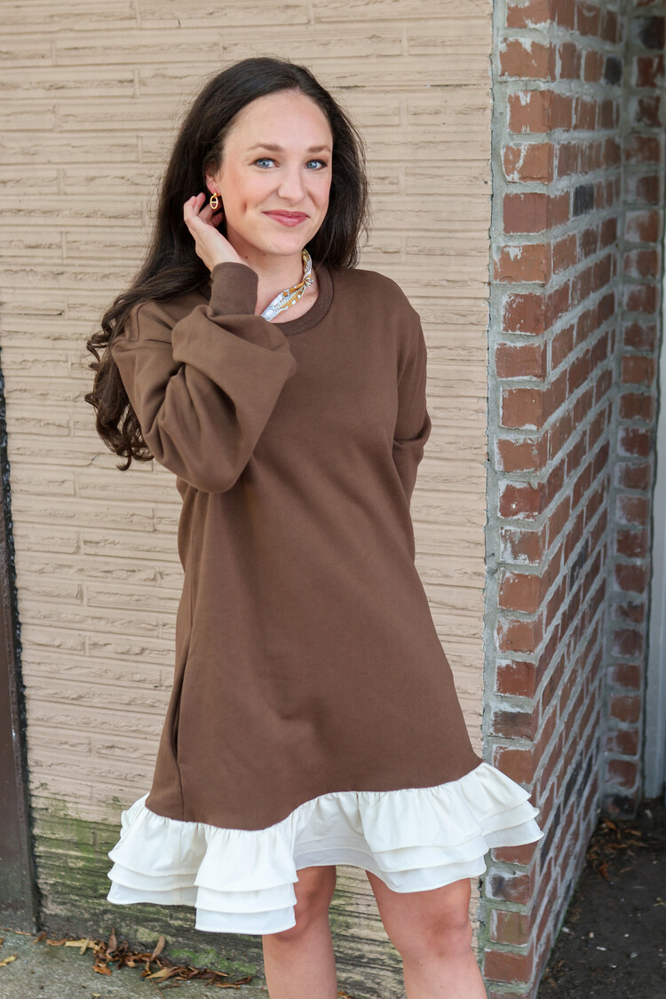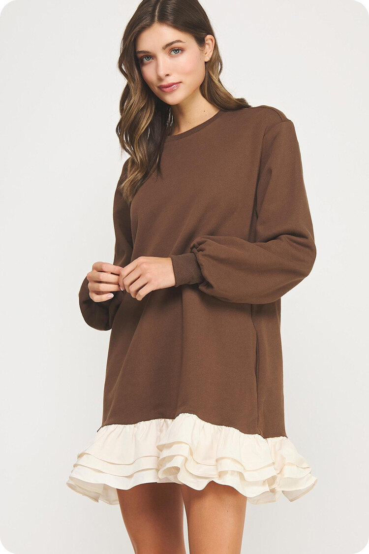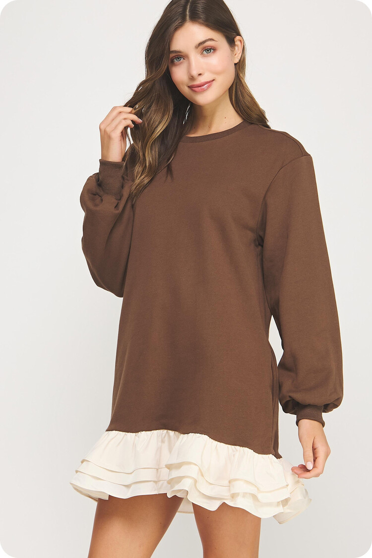 • Contrast ruffled hem sweatshirt mini dress in stretch knit and satin poplin fabric. This mixed media relaxed stylish dress features a playful tiered ruffle hem in satin poplin fabric, long sleeve with ribbed cuff, ribbed found neck, and side pockets.
