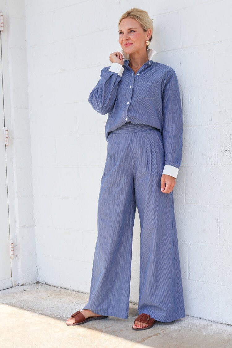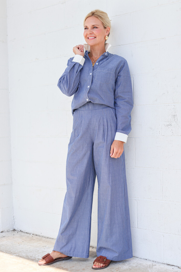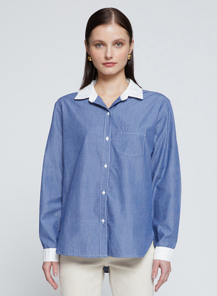 • Our take on a menswear classic. Our relaxed style has a white contrast collar and cuff and pocket detail.