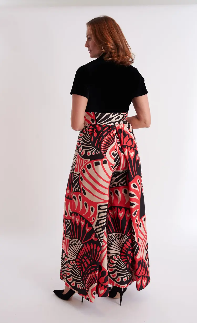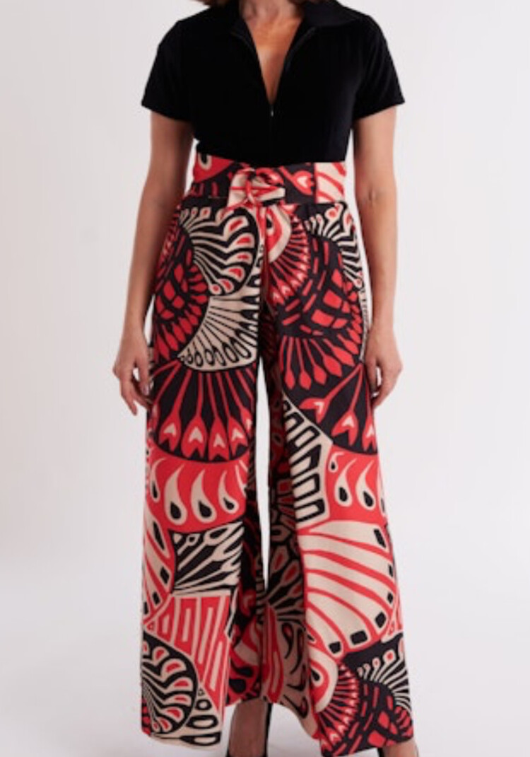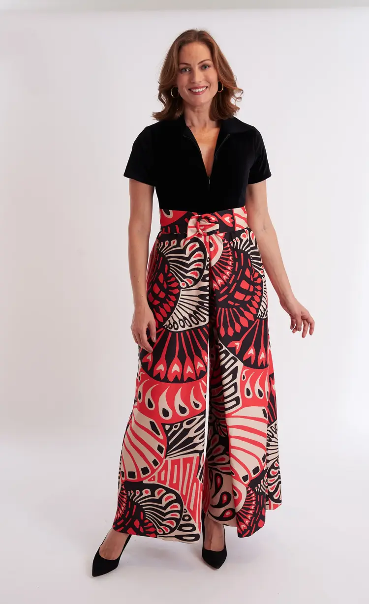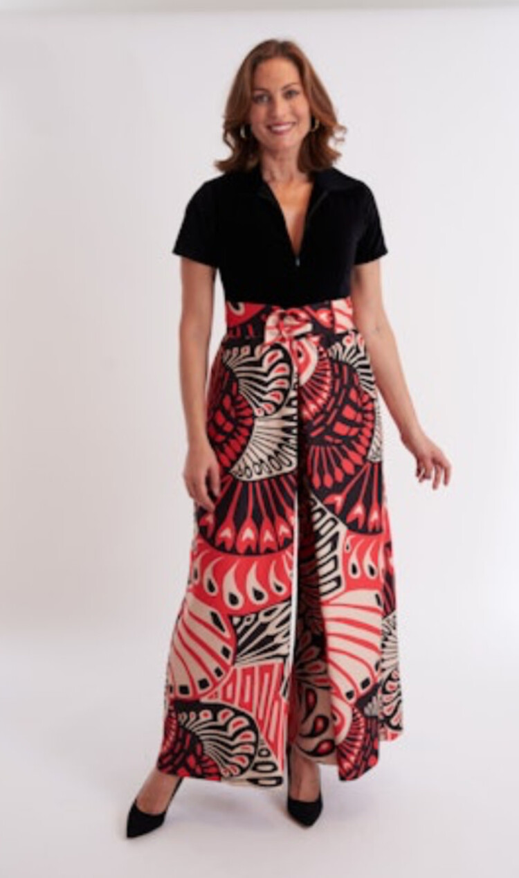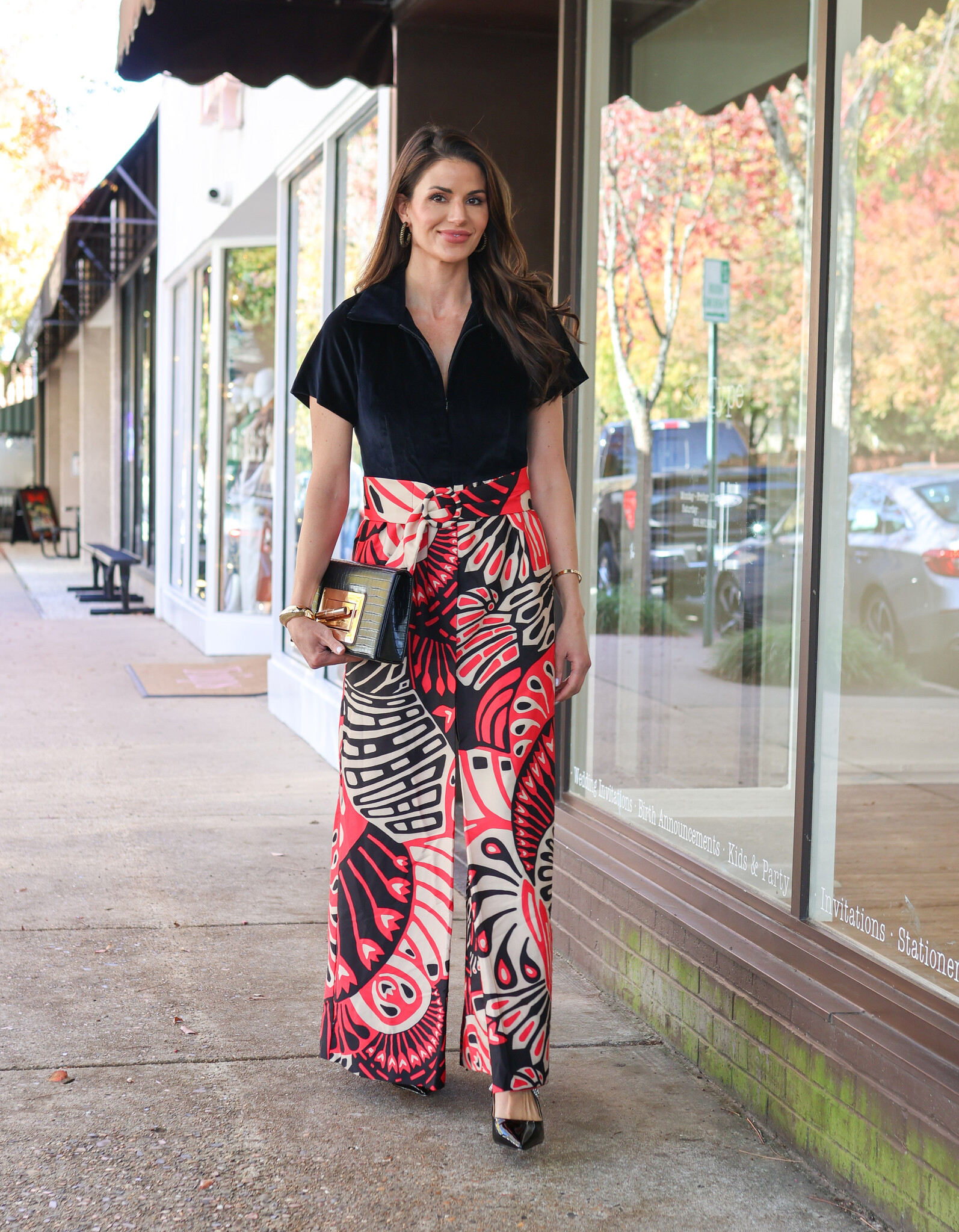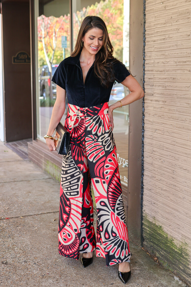 • A gorgeous jumpsuit that makes a chic statement! We love the patterned wide leg pants and black zip front top!