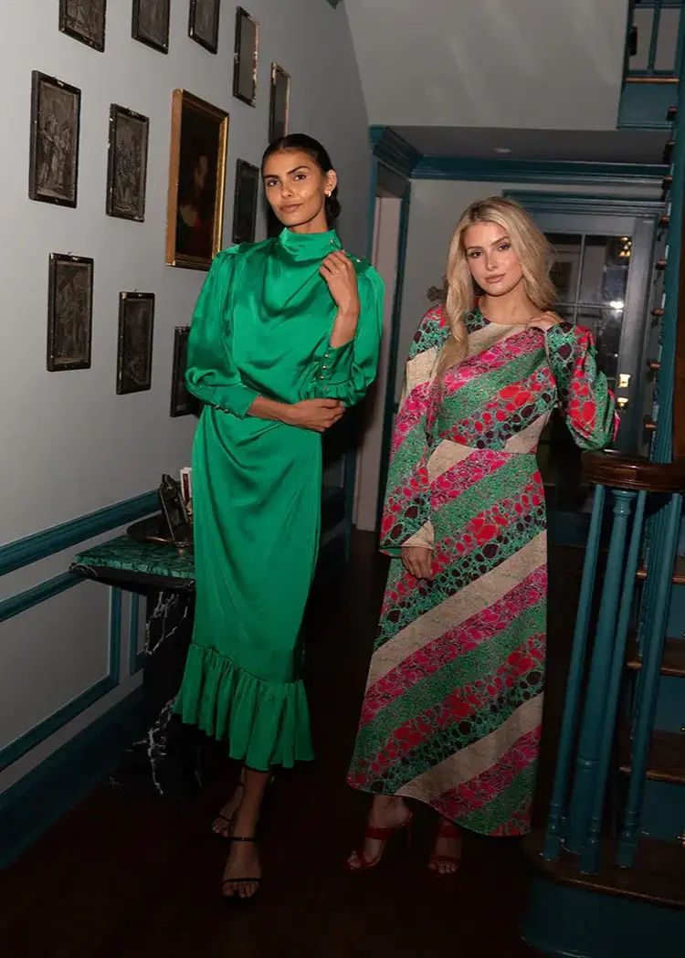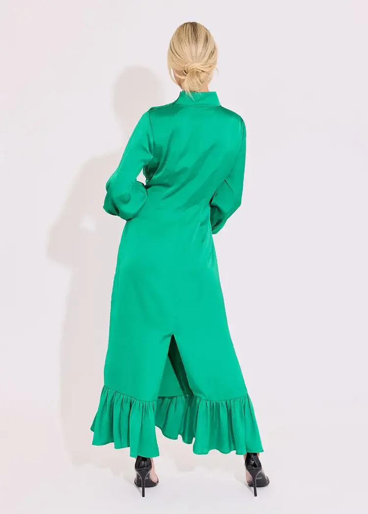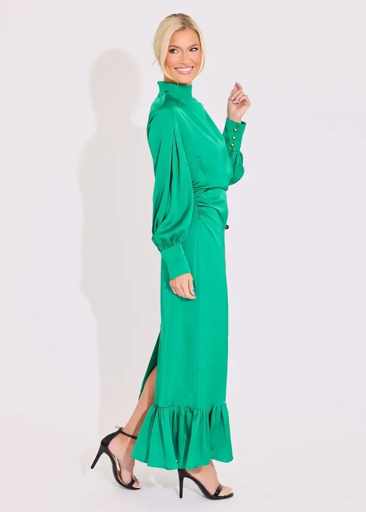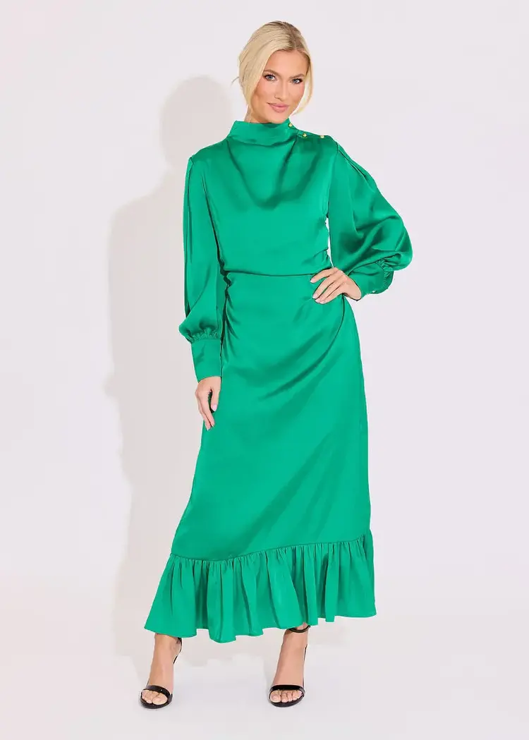 • Classy and chic, The Parker Dress is making a statement with a mock neck line, balloon sleeves and a maxi skirt with ruffle trim.