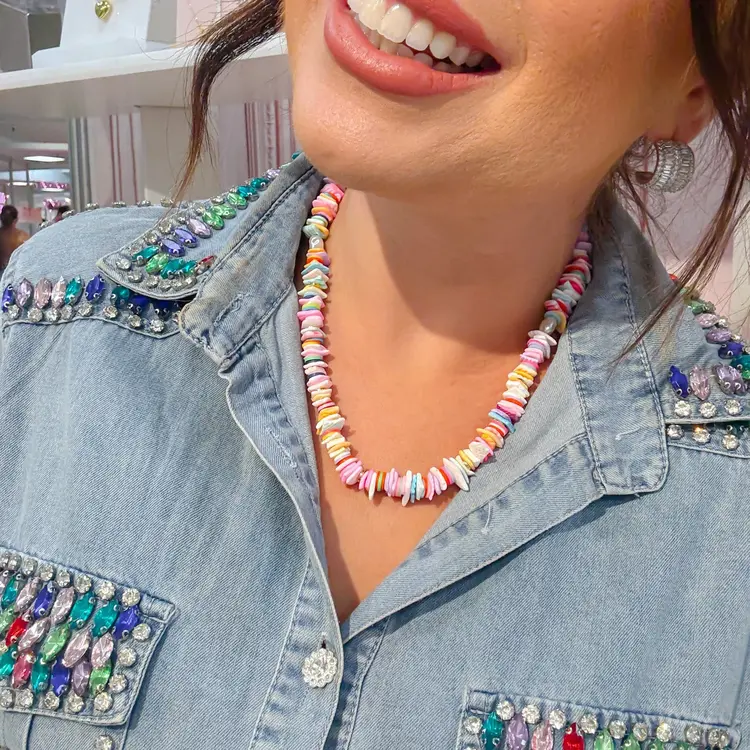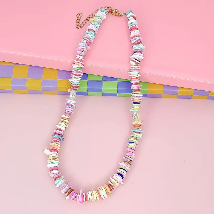 A playful mix of irregular shell like beads in cotton candy hues. From baby blue to bubblegum pink, each piece brings soft whimsy and bold personality to your neckline. Lightweight and colorful.