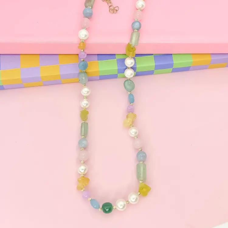 • Fresh, fun, and full of charm — the Pastel Picnic Necklace is a dreamy mix of soft hues and whimsical shapes. With glossy pearls, playful beads, and pops of mint, lilac, lemon, and seafoam, it’s giving carefree spring day energy.