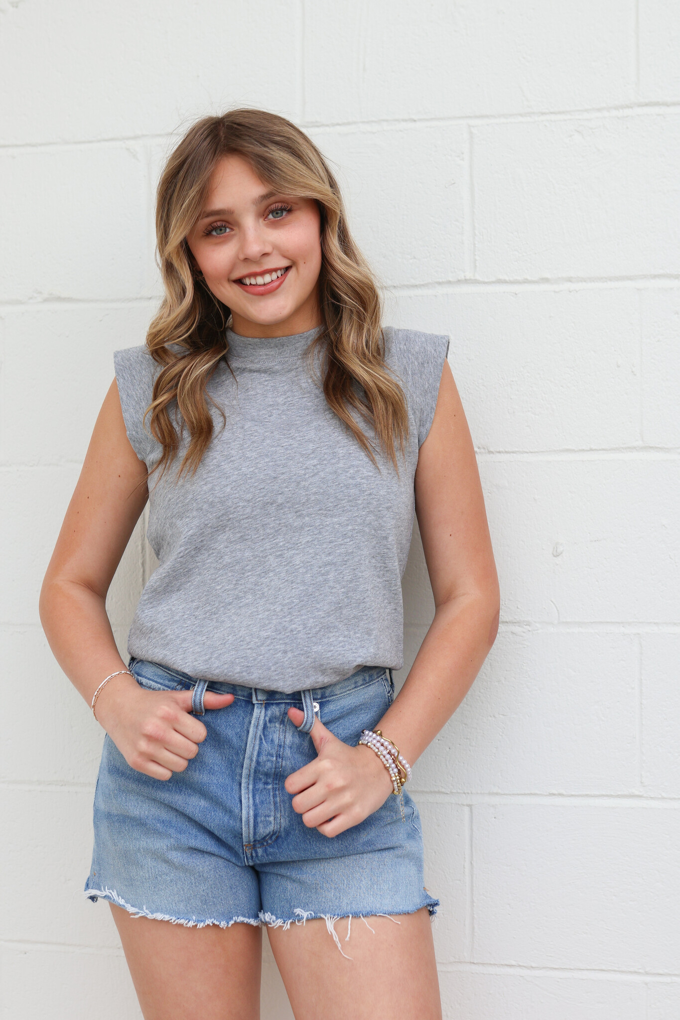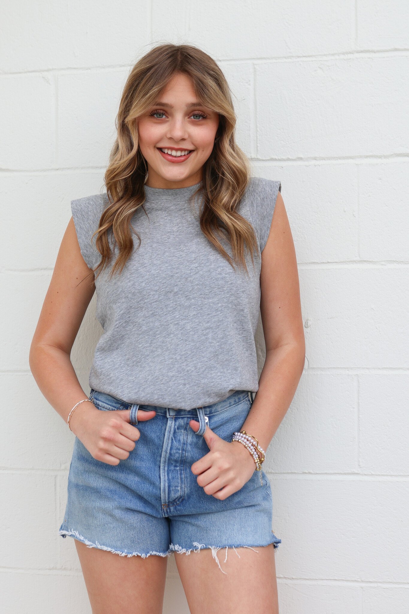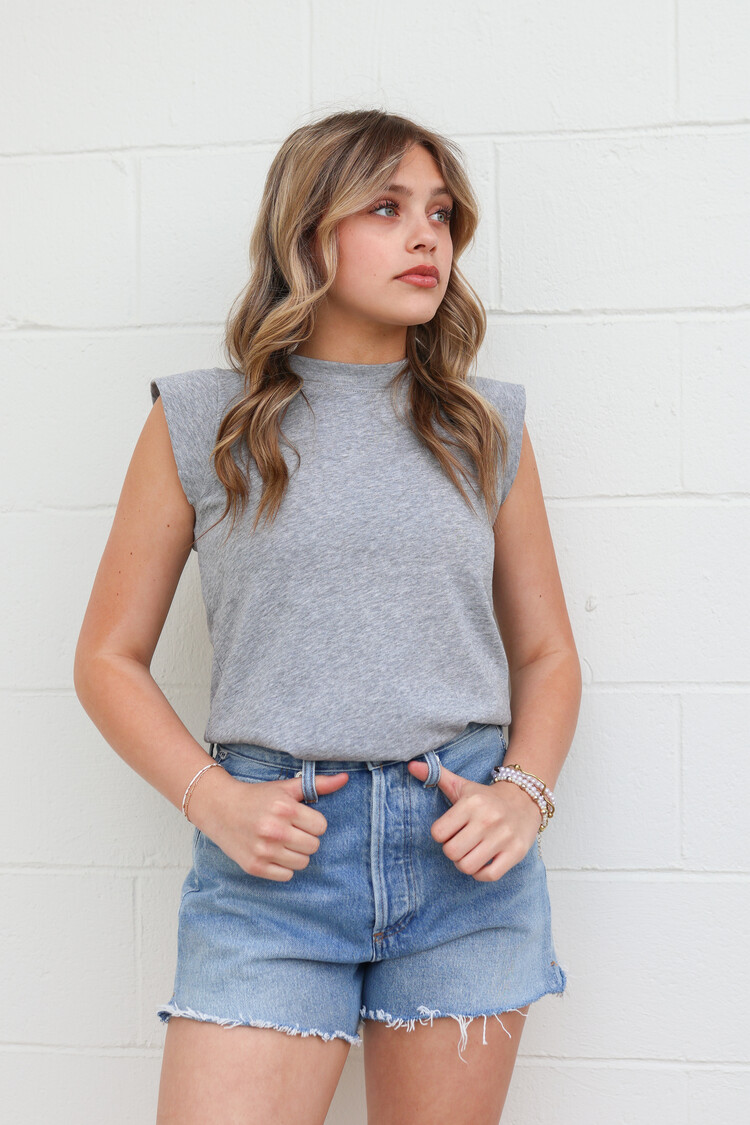 A muscle tank, but make it feminine, with a ribbed, crew neckline and over the shoulder short sleeves.