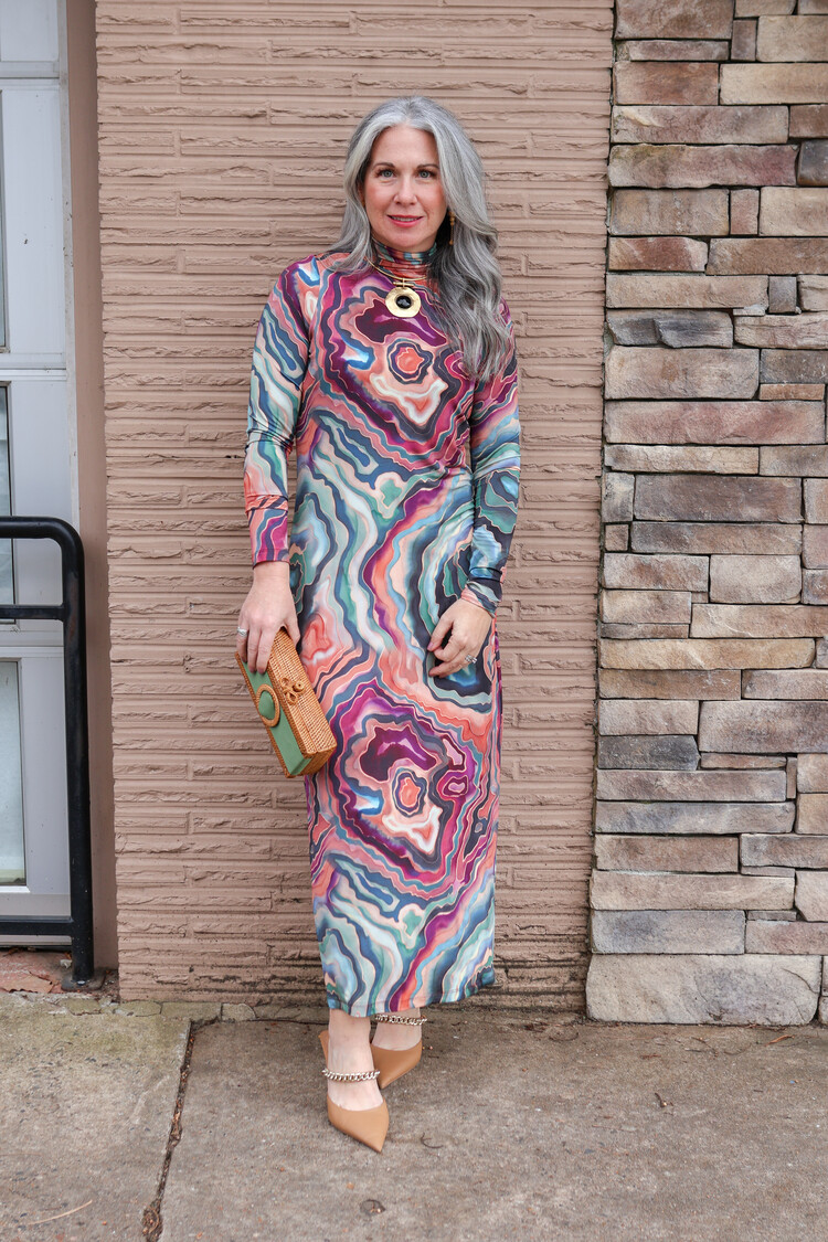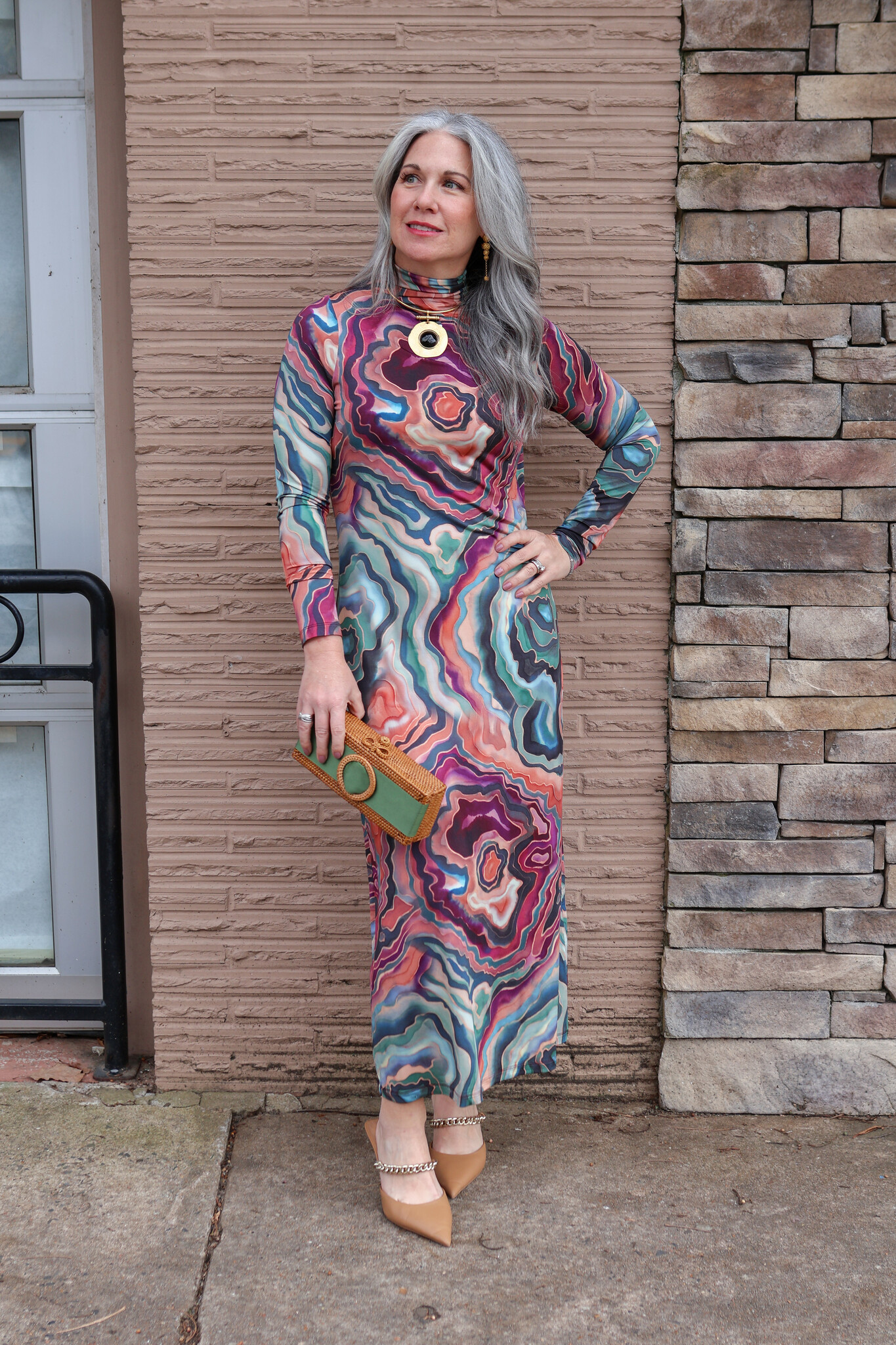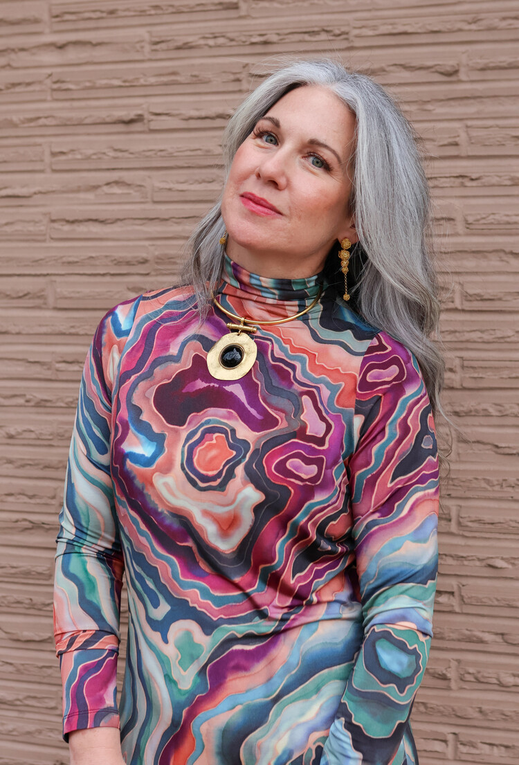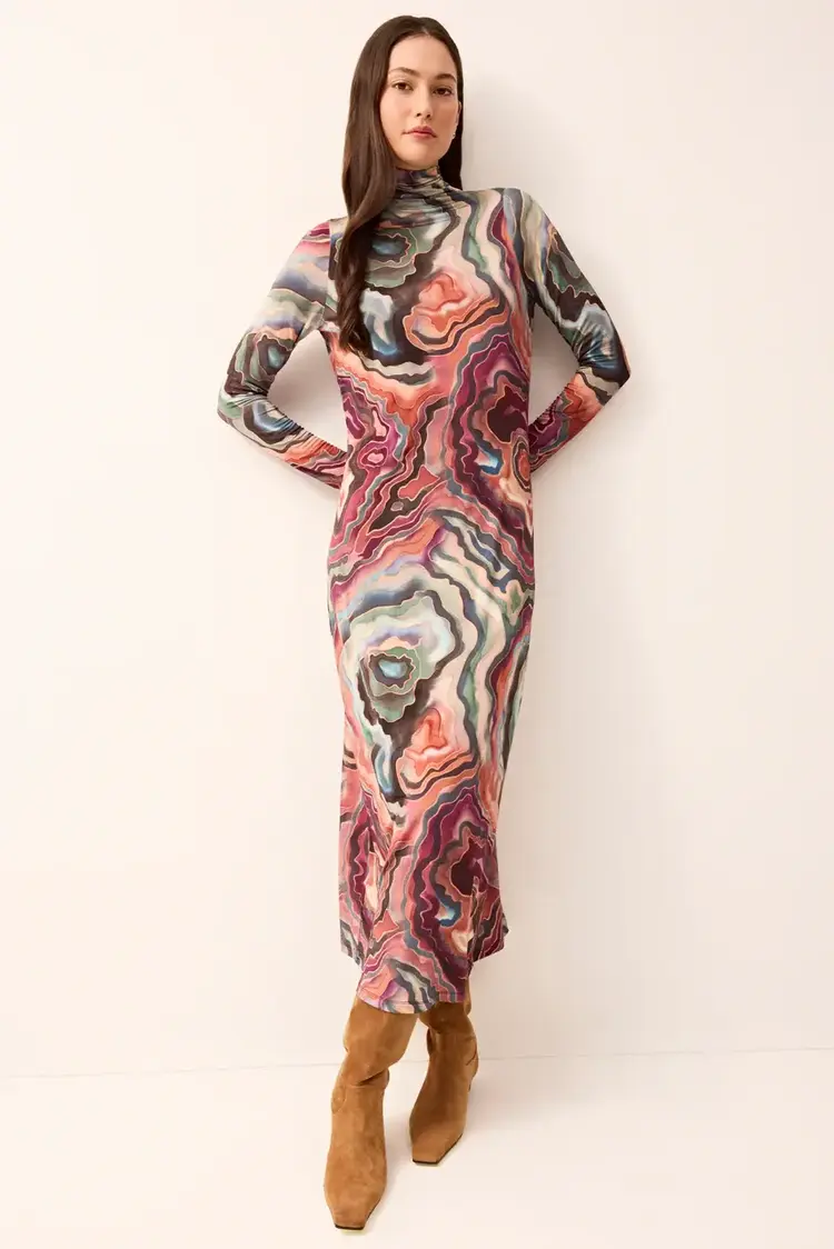 • One of our Founder’s favorite seasonal silhouettes, this figure-skimming turtleneck dress is crafted from soft jersey knit that enhances Paxton’s elegant lines. Shown in Strata, a colorful geological print, the slip-on style makes a modern statement.