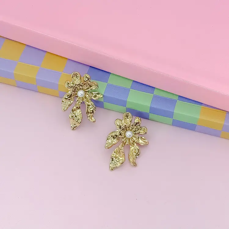 • Bring a touch of golden elegance to your look with these radiant floral statement earrings. Sculpted with textured gold petals and finished with a delicate pearl at the center.