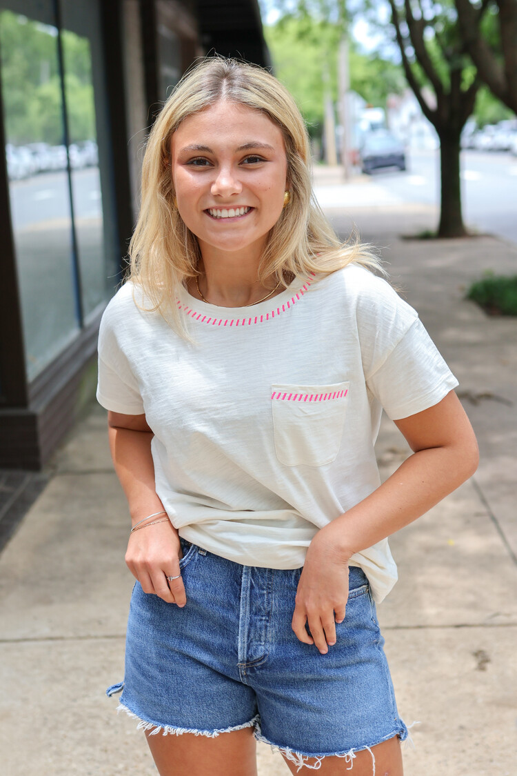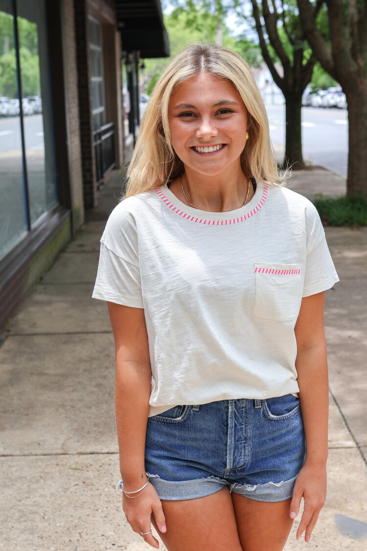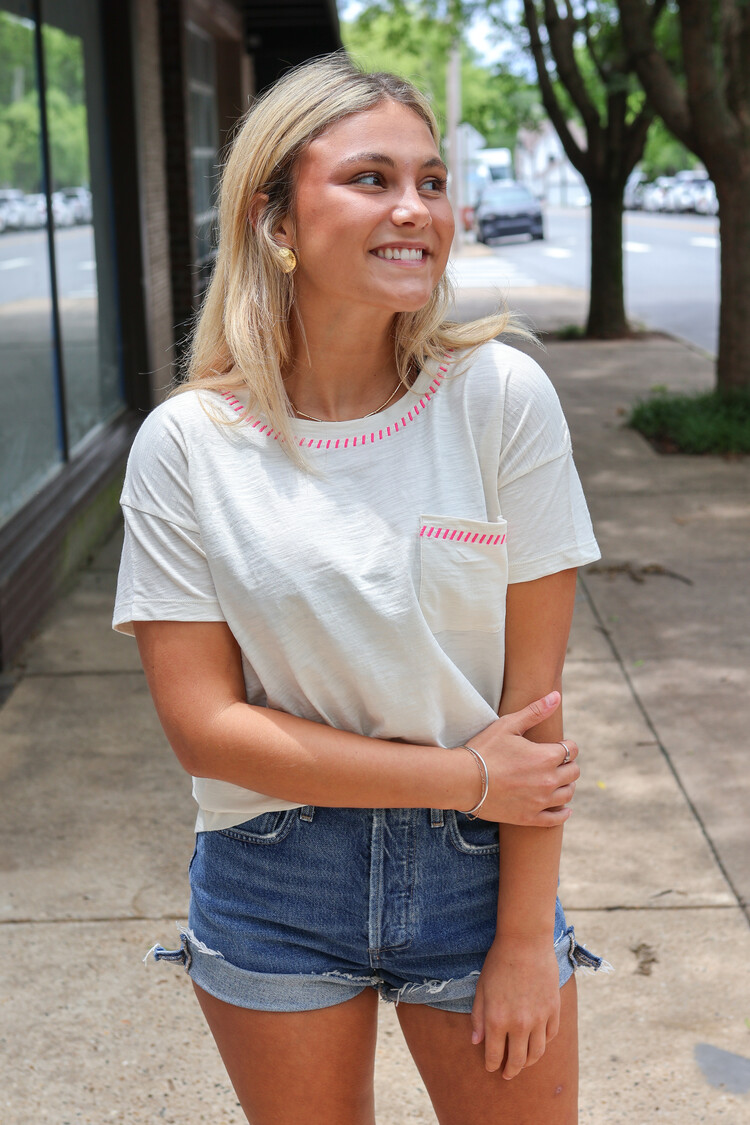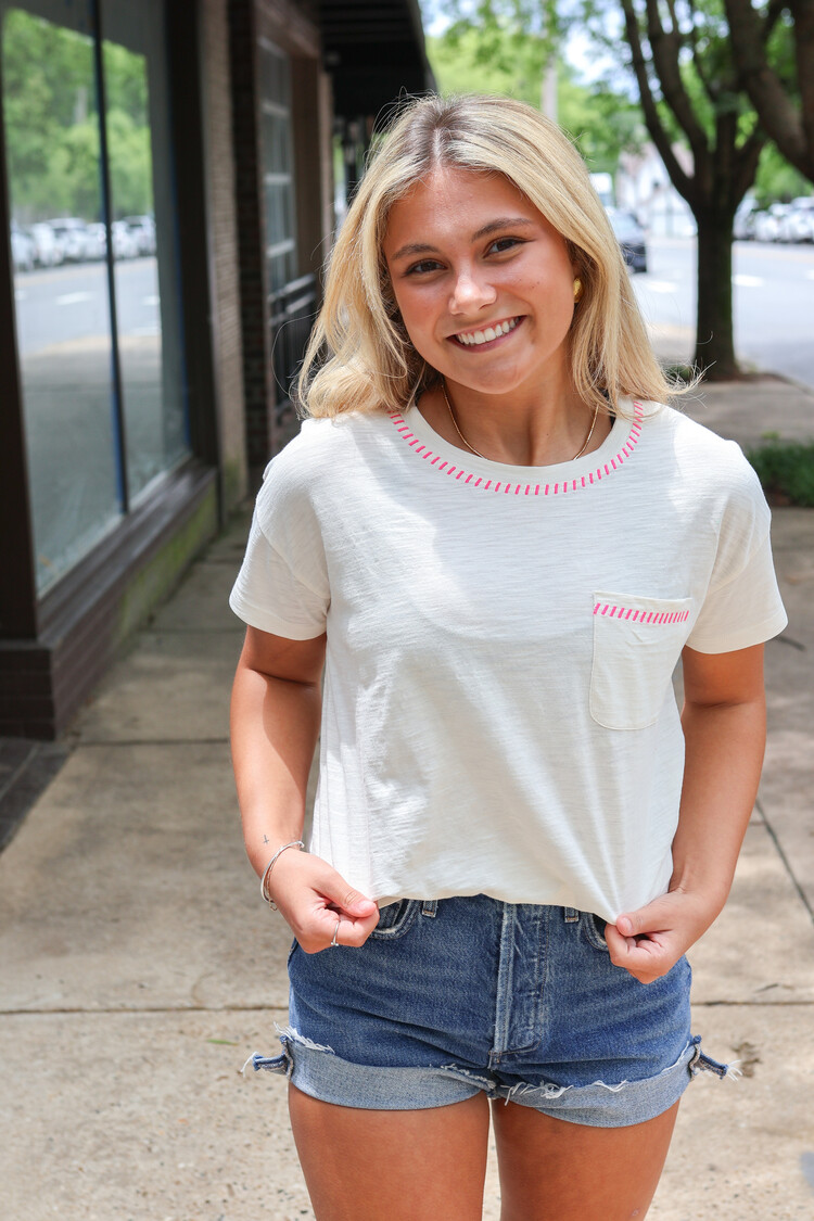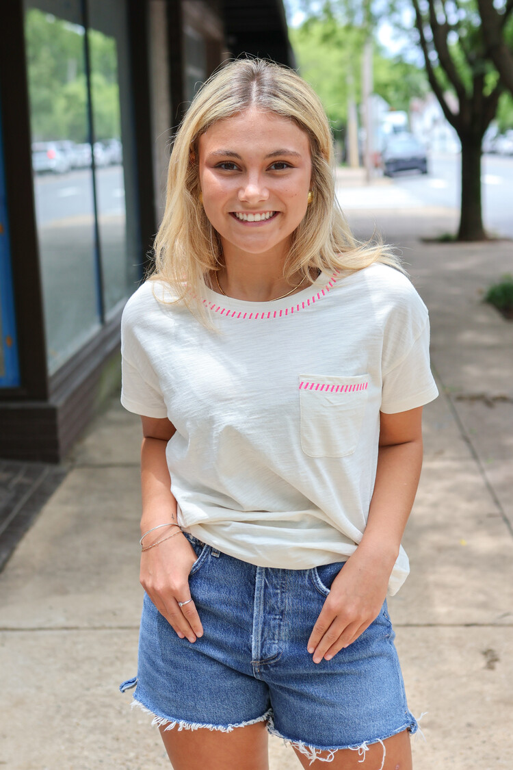 The essential of the season, the Pick Me Up pocket tee embraces the simple elegance of a contrast hand stitch on the neck and pocket. Made in a soft premium Cotton, this style has a curved hemline that drapes perfectly over your favorite jeans or shorts.