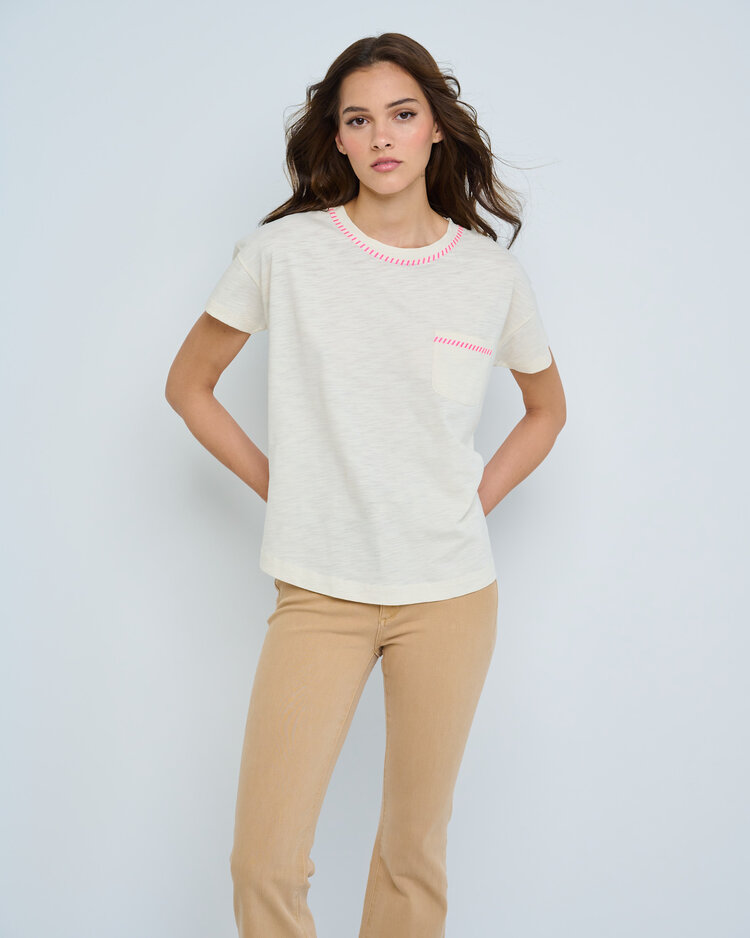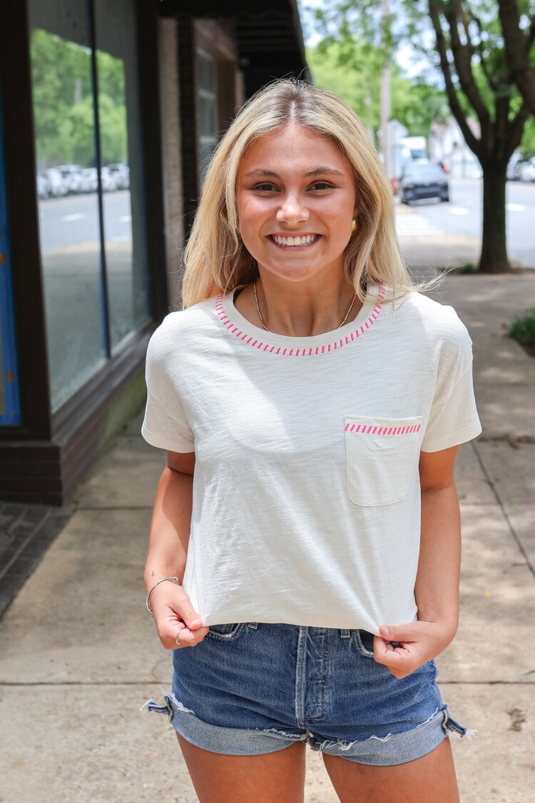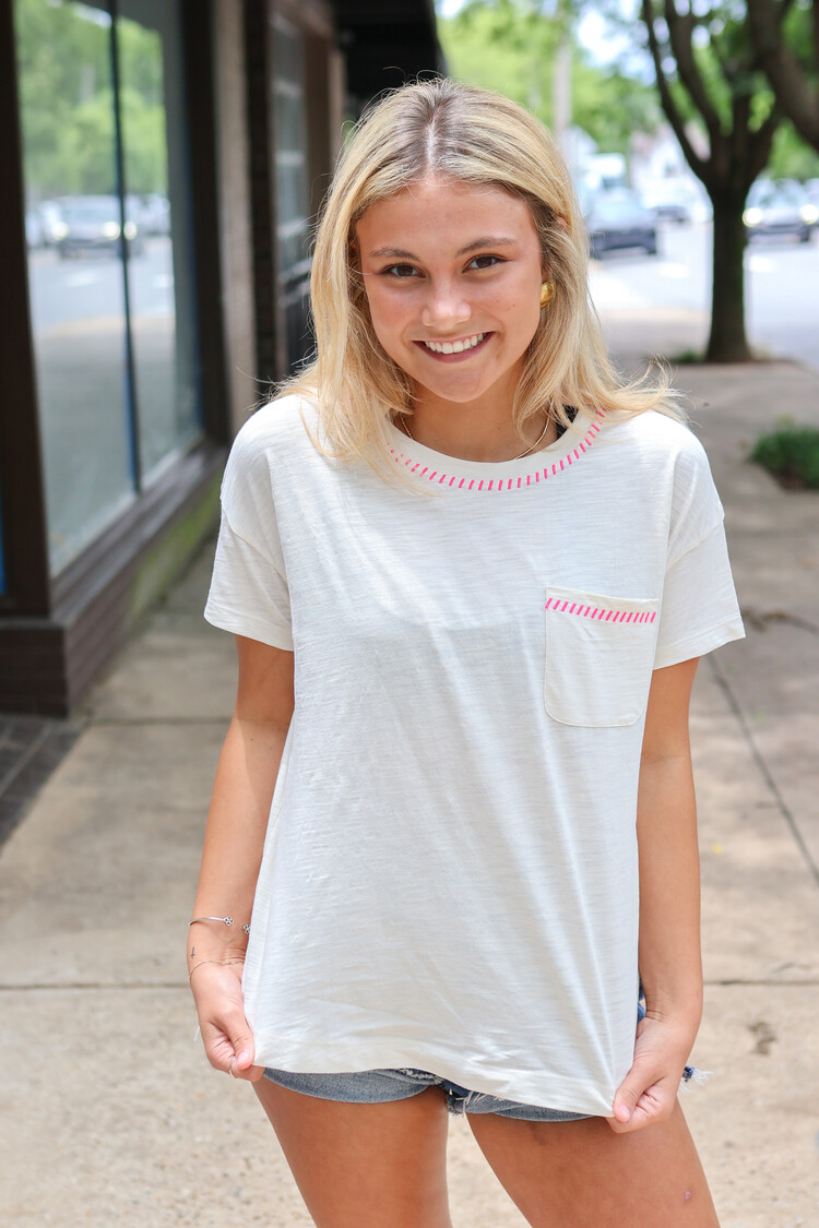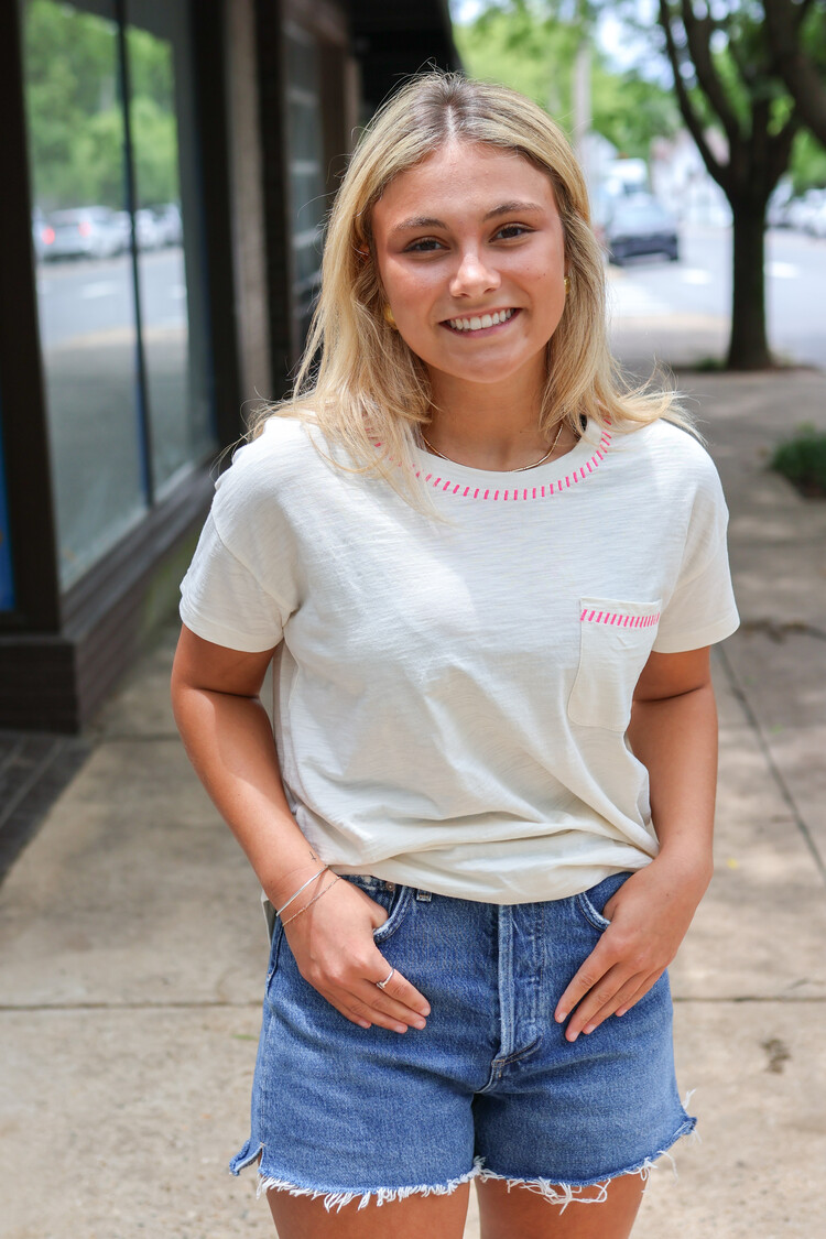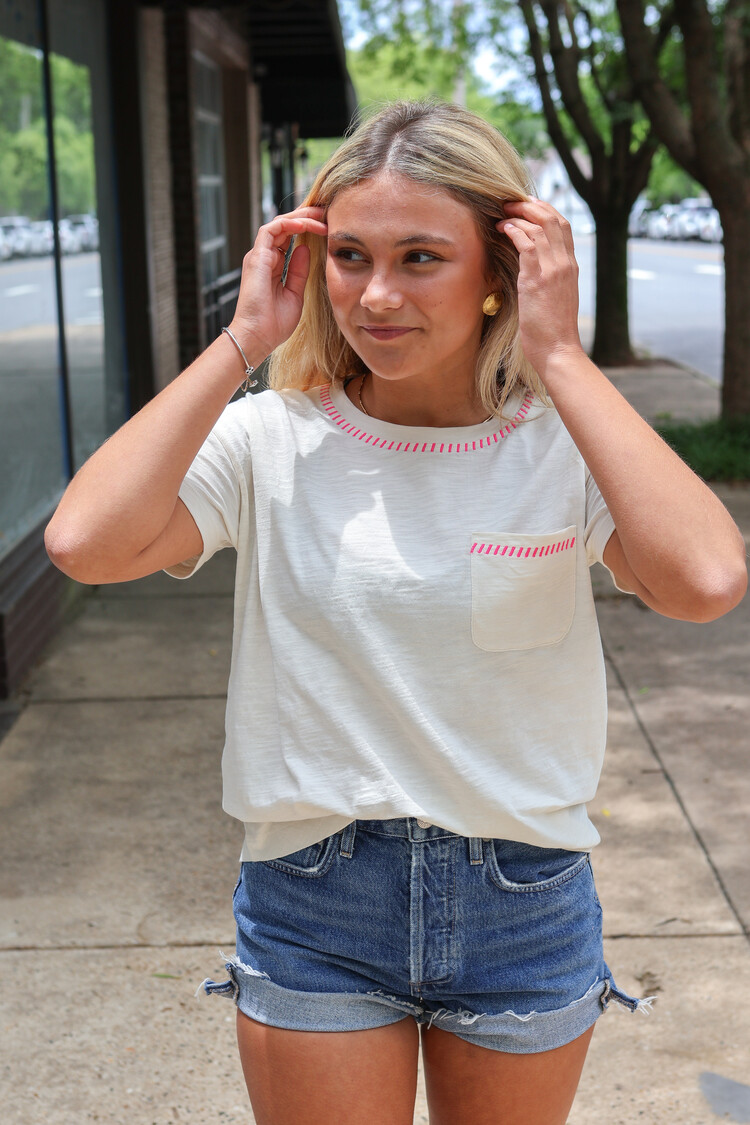 The essential of the season, the Pick Me Up pocket tee embraces the simple elegance of a contrast hand stitch on the neck and pocket. Made in a soft premium Cotton, this style has a curved hemline that drapes perfectly over your favorite jeans or shorts.