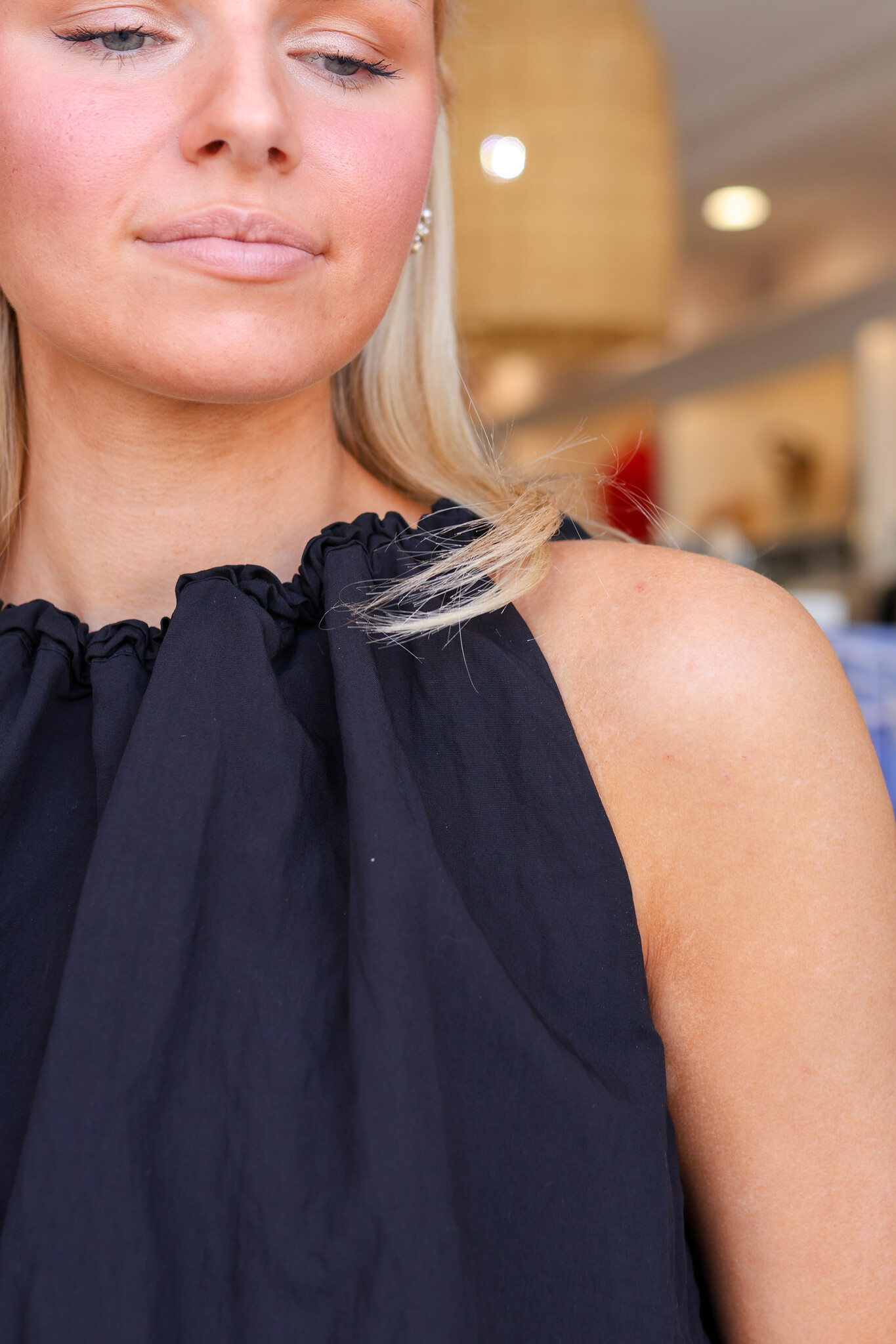 • This halter-style top features a gathered neckline with adjustable tie closure at the back and a relaxed, balloon-style hemline. 85% Rayon, 15% Nylon