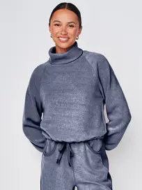 This funnel neck pullover showcases a soft, heathered navy fabric with a relaxed silhouette, featuring a cozy high neckline and raglan sleeves. Its adjustable waist and plush texture make it an ideal piece for both lounging and casual outings.