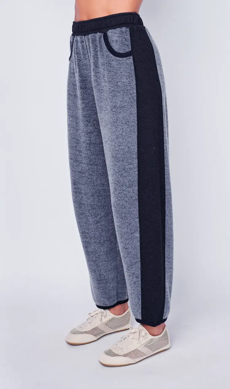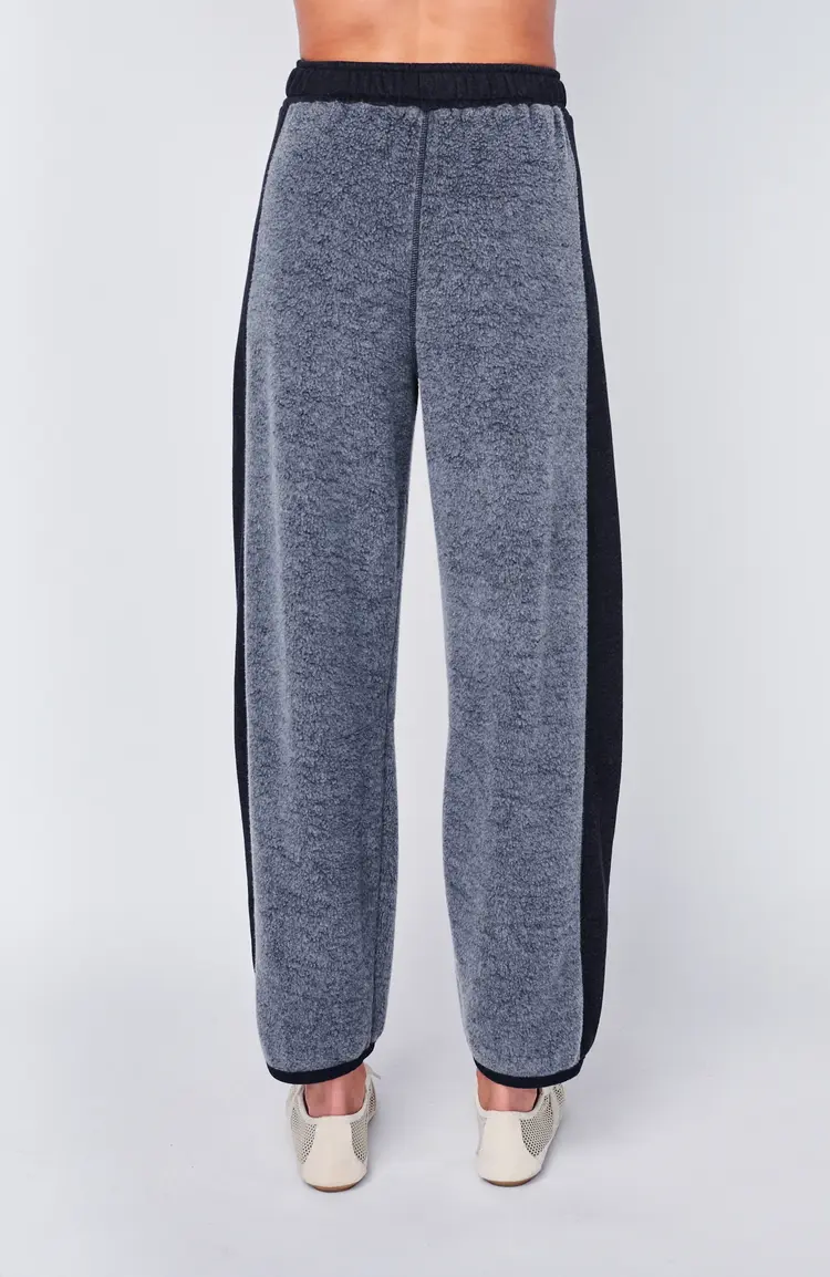 • These trousers are relaxed-fit, straight-leg lounge pants made from a soft, heathered grey knit with contrasting dark side panels for a sporty look.