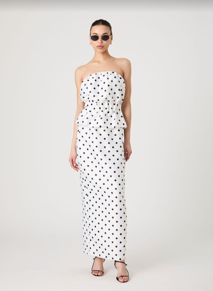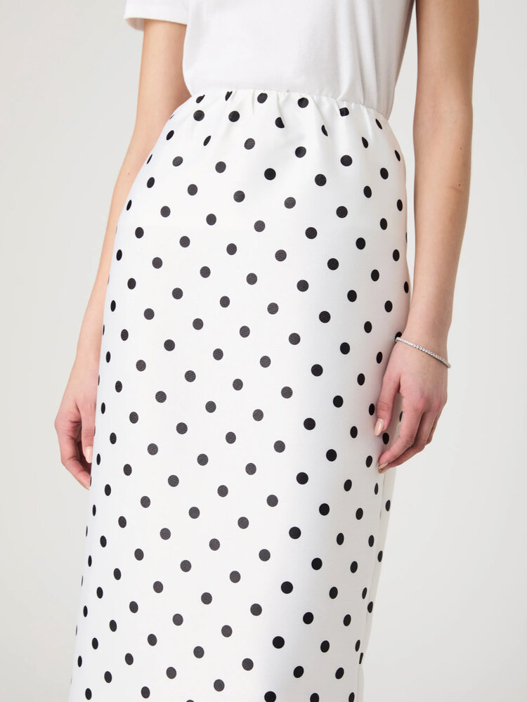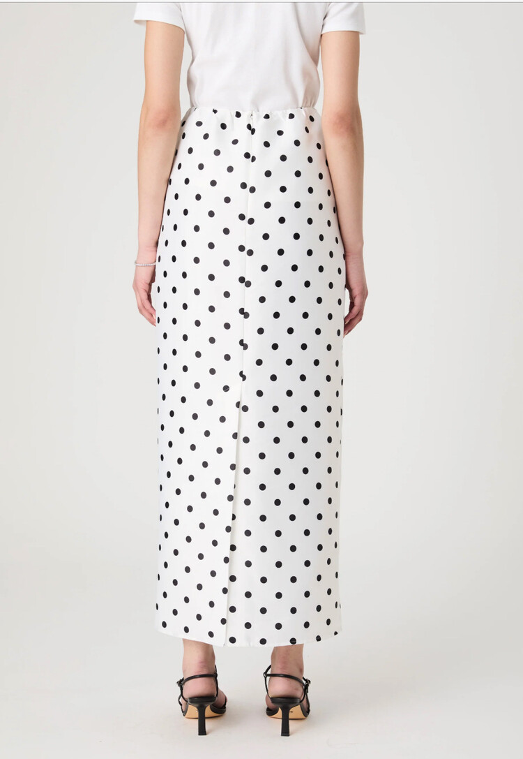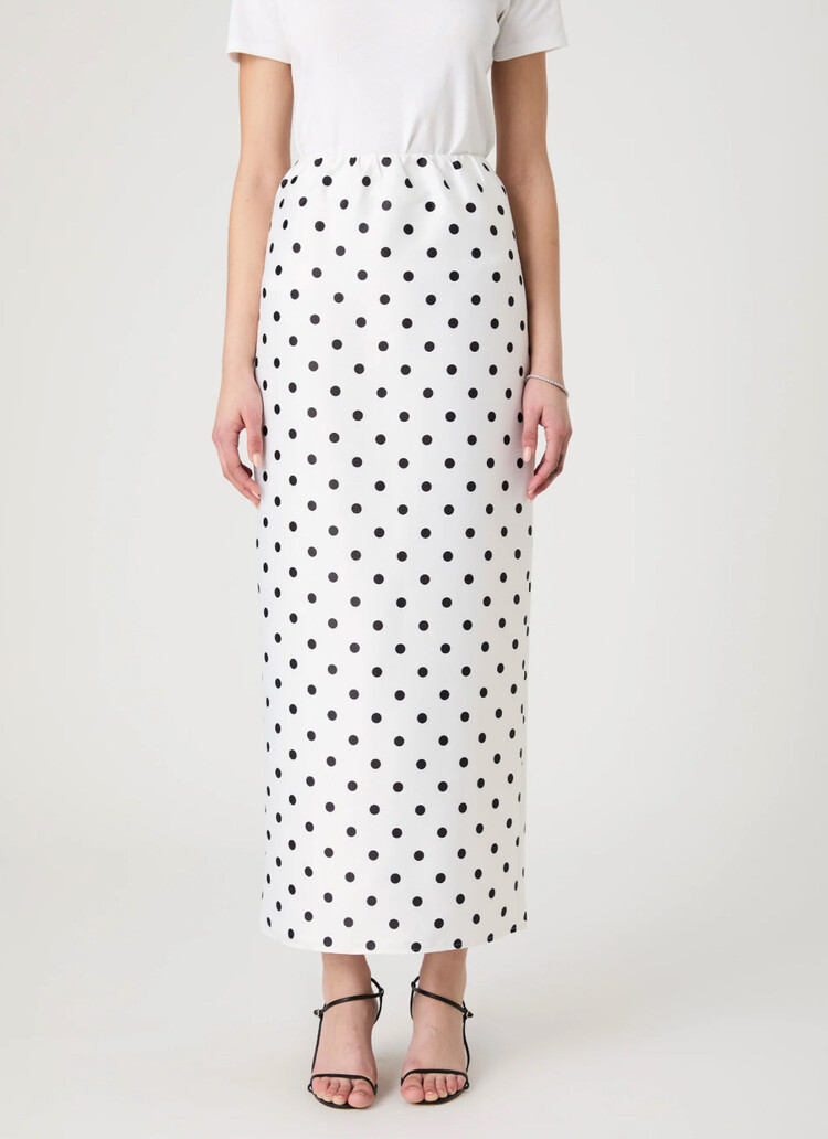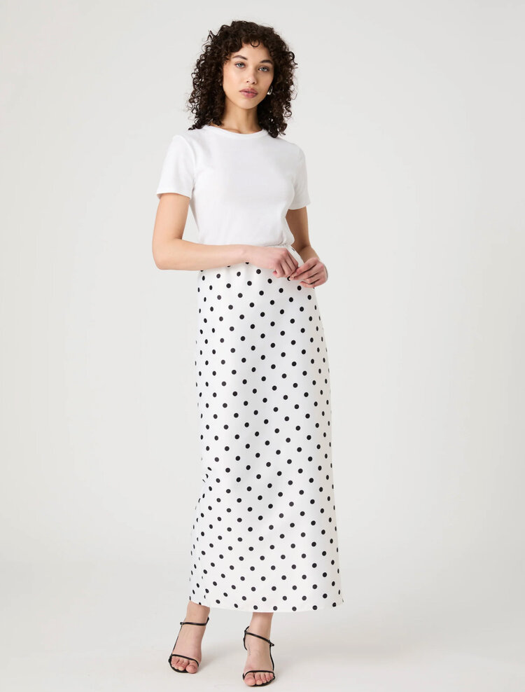 • Our Polka Dot Maxi Skirt is made from structured satin in a classic black-and-white polka dot print—polished enough for a night out, playful enough for daytime plans. Pairs well with our matching Strapless Polka Dot Peplum Top.