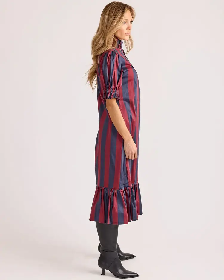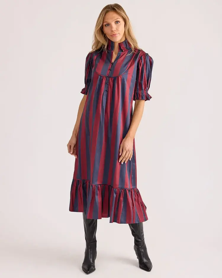 • The Priestly is back for Fall! Featuring a puff sleeve and ruffle collar, this midi dress is exactly what your wardrobe needs in our beautiful vineyard stripe.