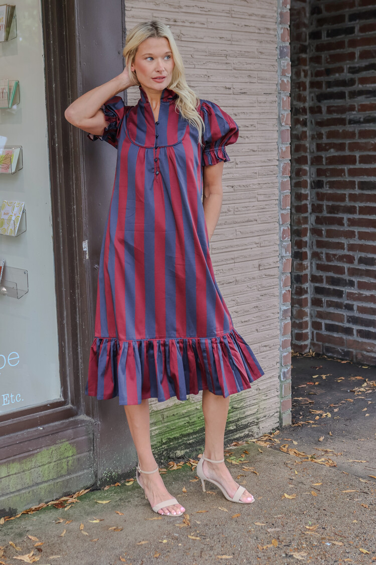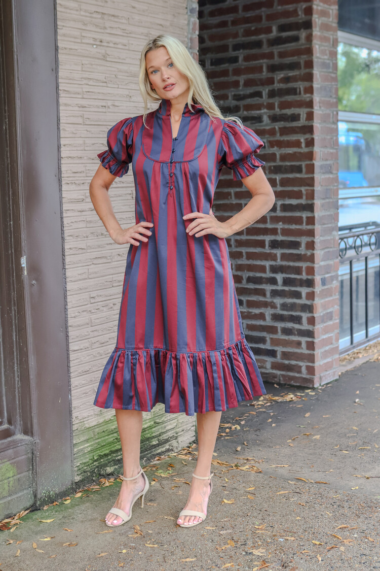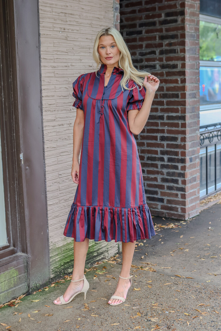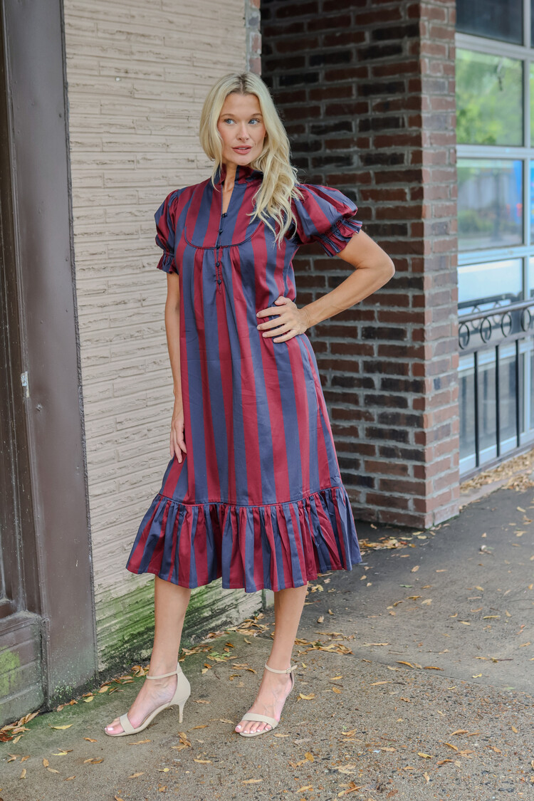 The Priestly is back for Fall! Featuring a puff sleeve and ruffle collar, this midi dress is exactly what your wardrobe needs in our beautiful vineyard stripe.