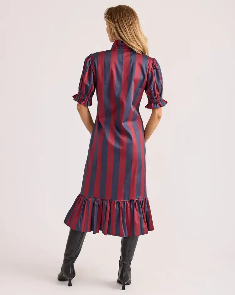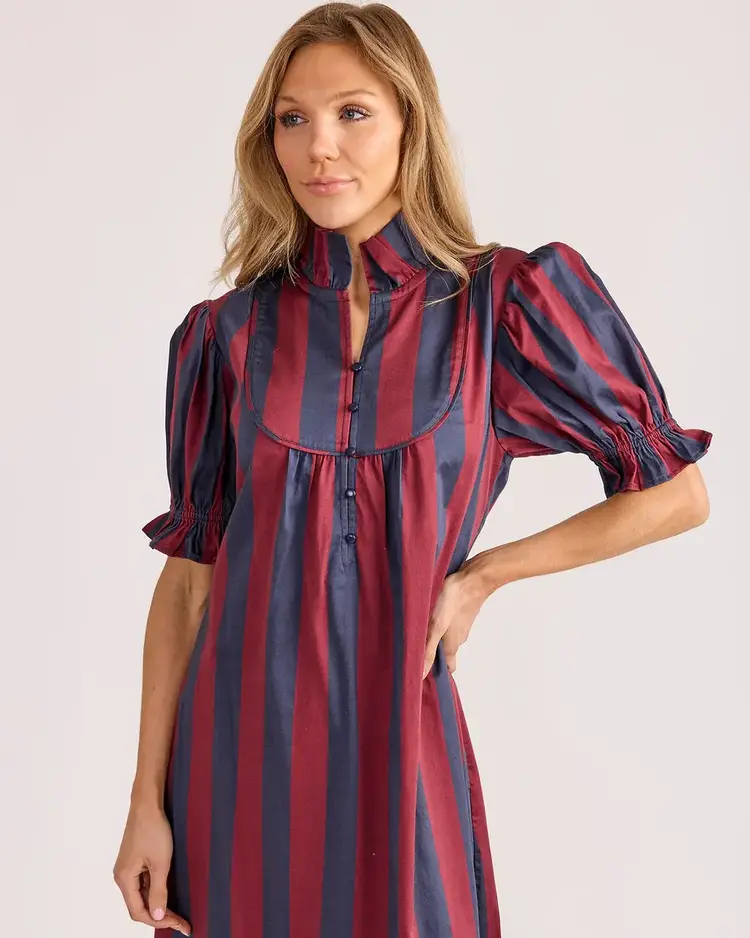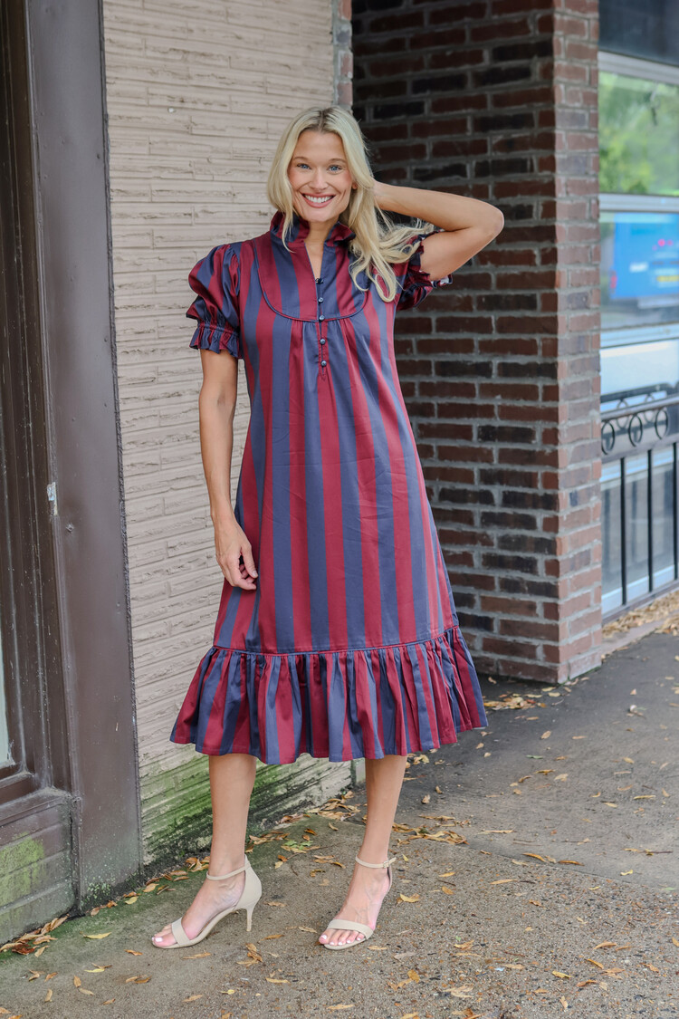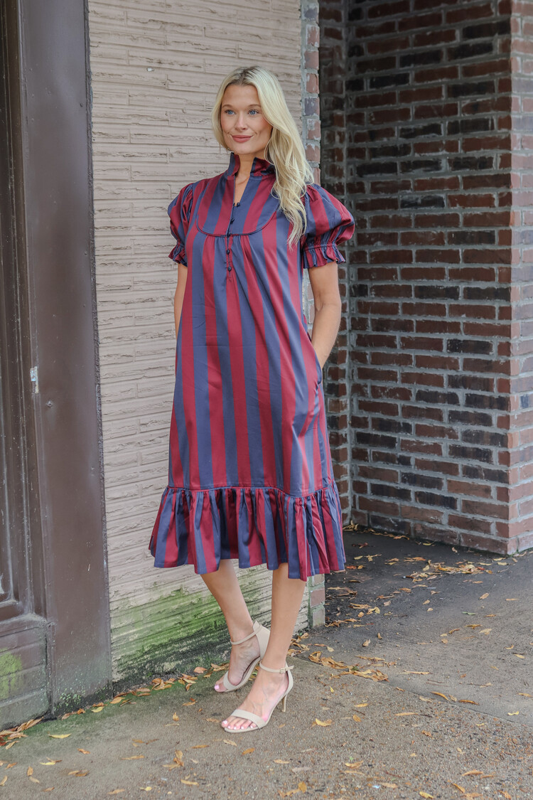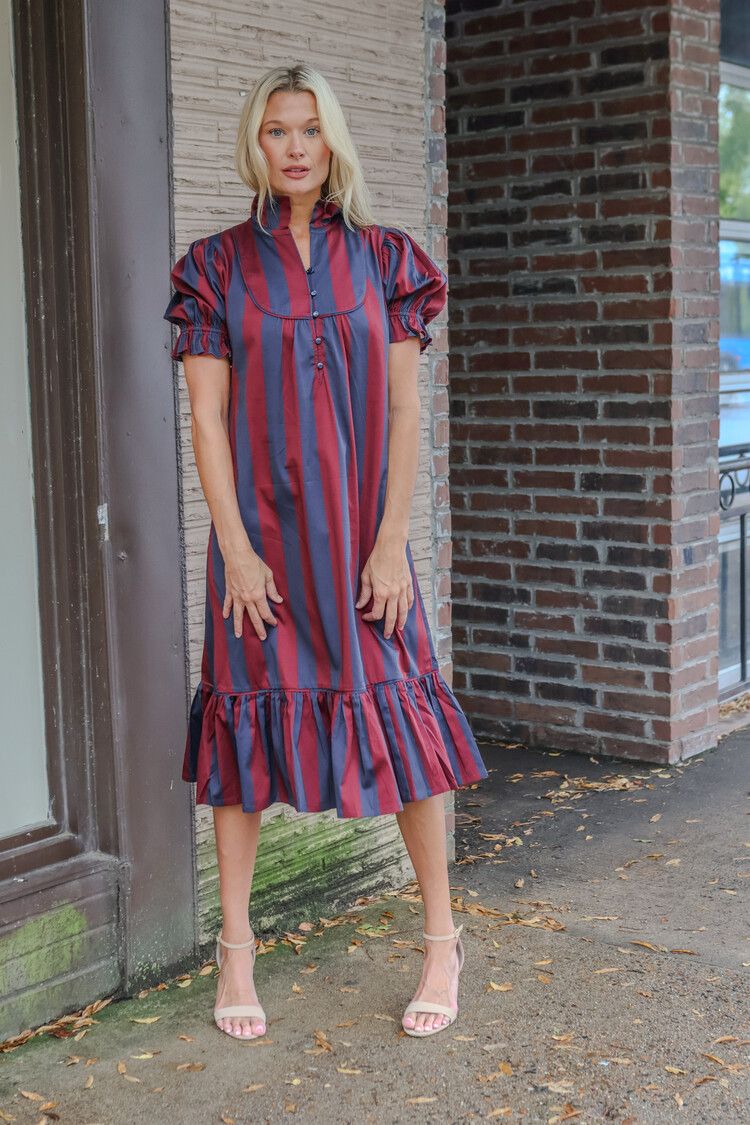 The Priestly is back for Fall! Featuring a puff sleeve and ruffle collar, this midi dress is exactly what your wardrobe needs in our beautiful vineyard stripe.