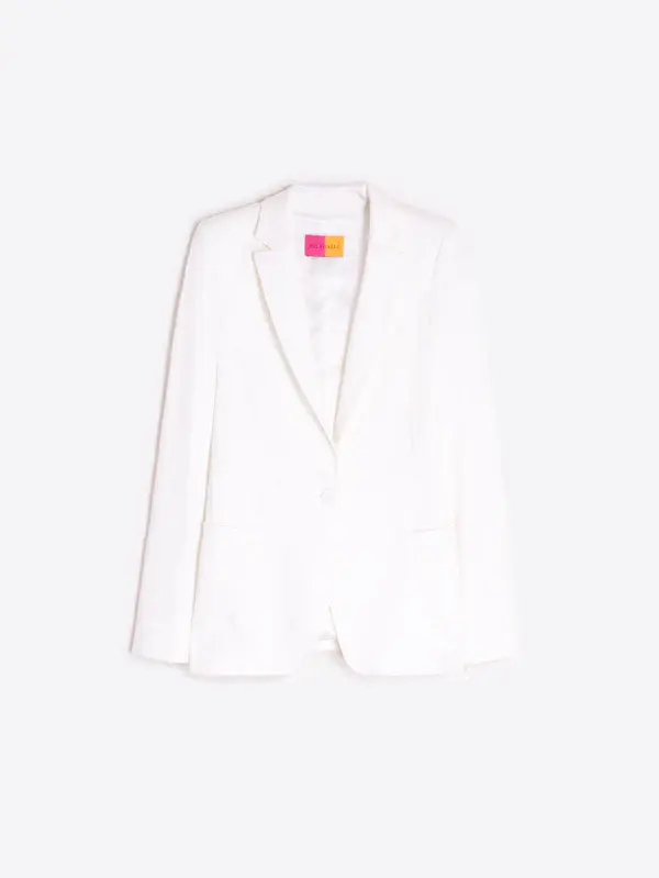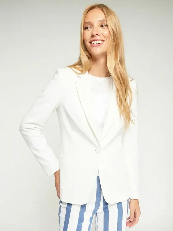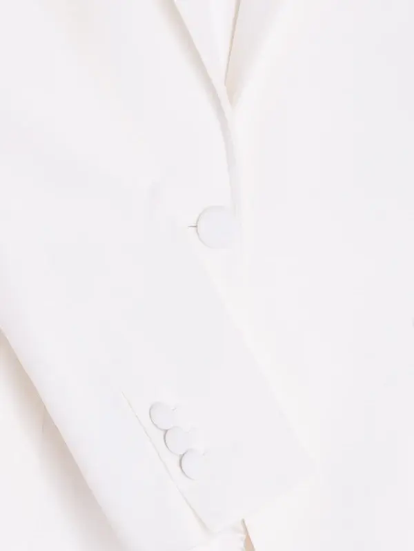 • White structured jacket with classic lapel and matching single-button front closure. Patch pockets at the front.