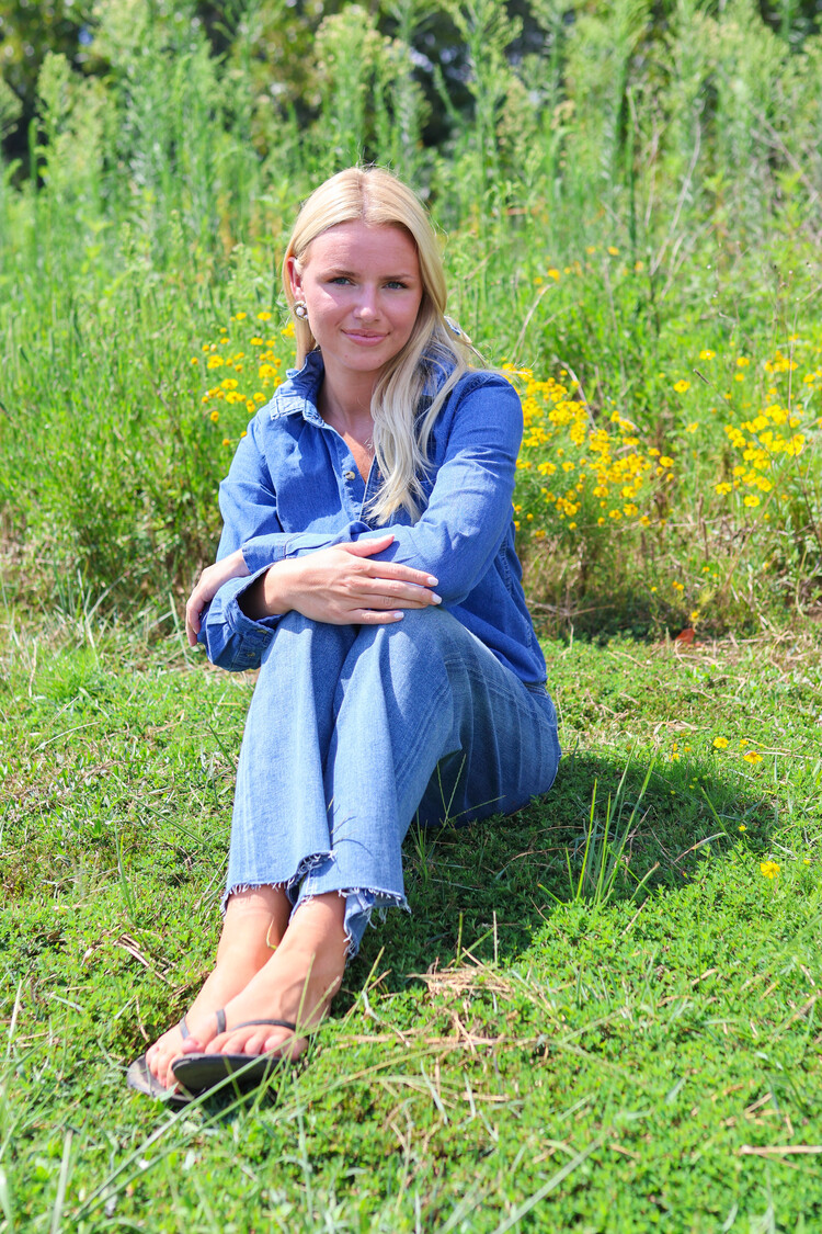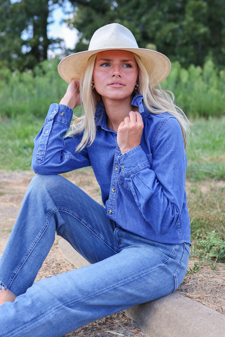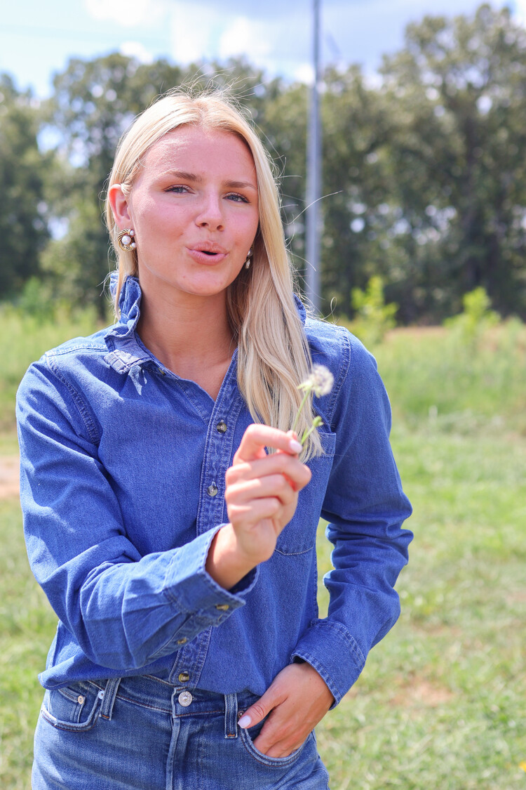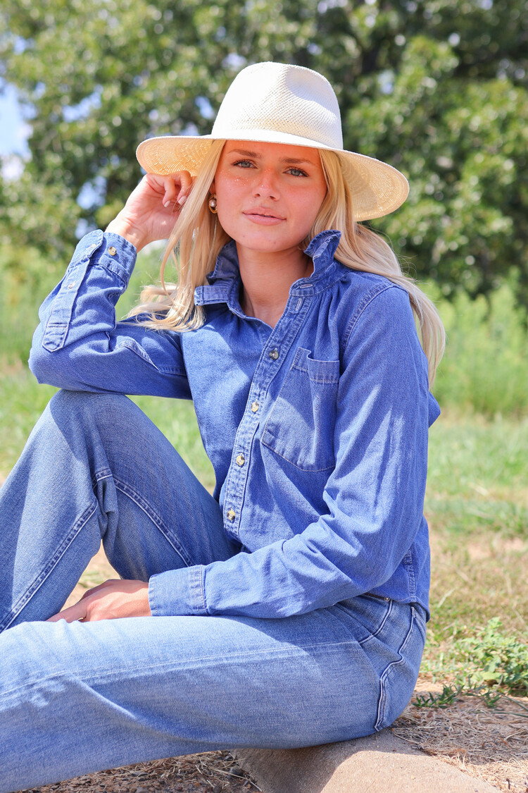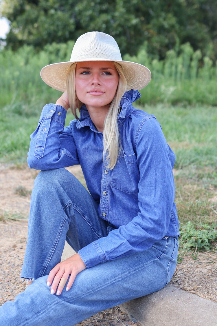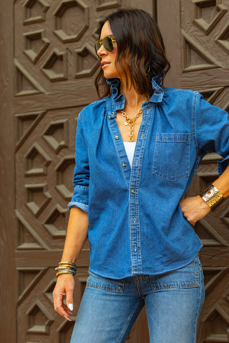 • Our Quarantina Top offers the comfort of a boyfriend shirt with a touch of feminine flair, courtesy of our signature ruffle collar. Wear it buttoned down for a relaxed vibe, tied at the bottom for added flair, or tucked in for a polished look.