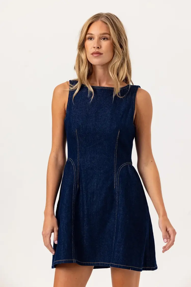 • The Rae Dress is a structured yet feminine take on the denim mini, balancing tailored lines with soft movement through the skirt.