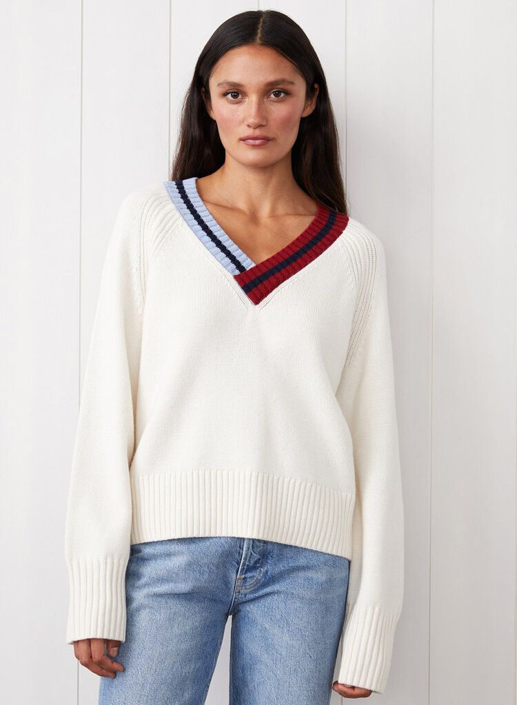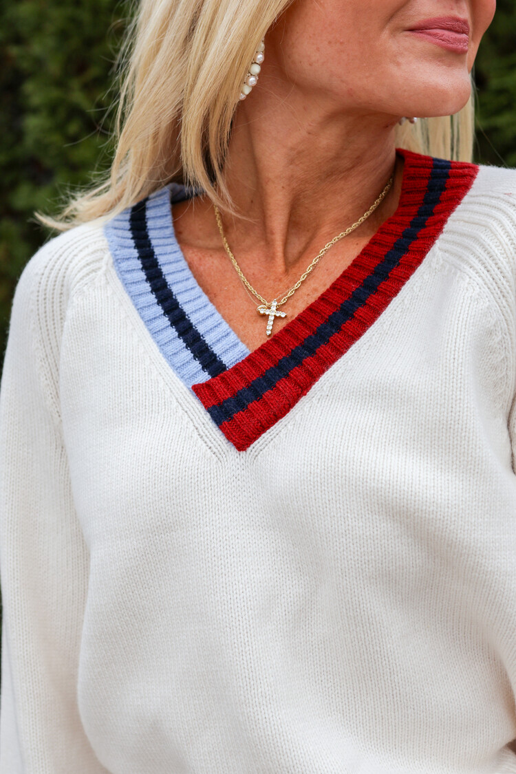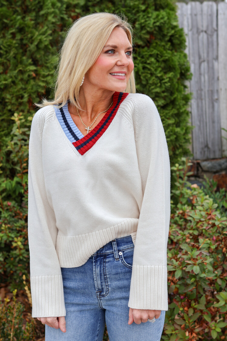 • An understated, yet stylish sweater with varsity stripe detailing!