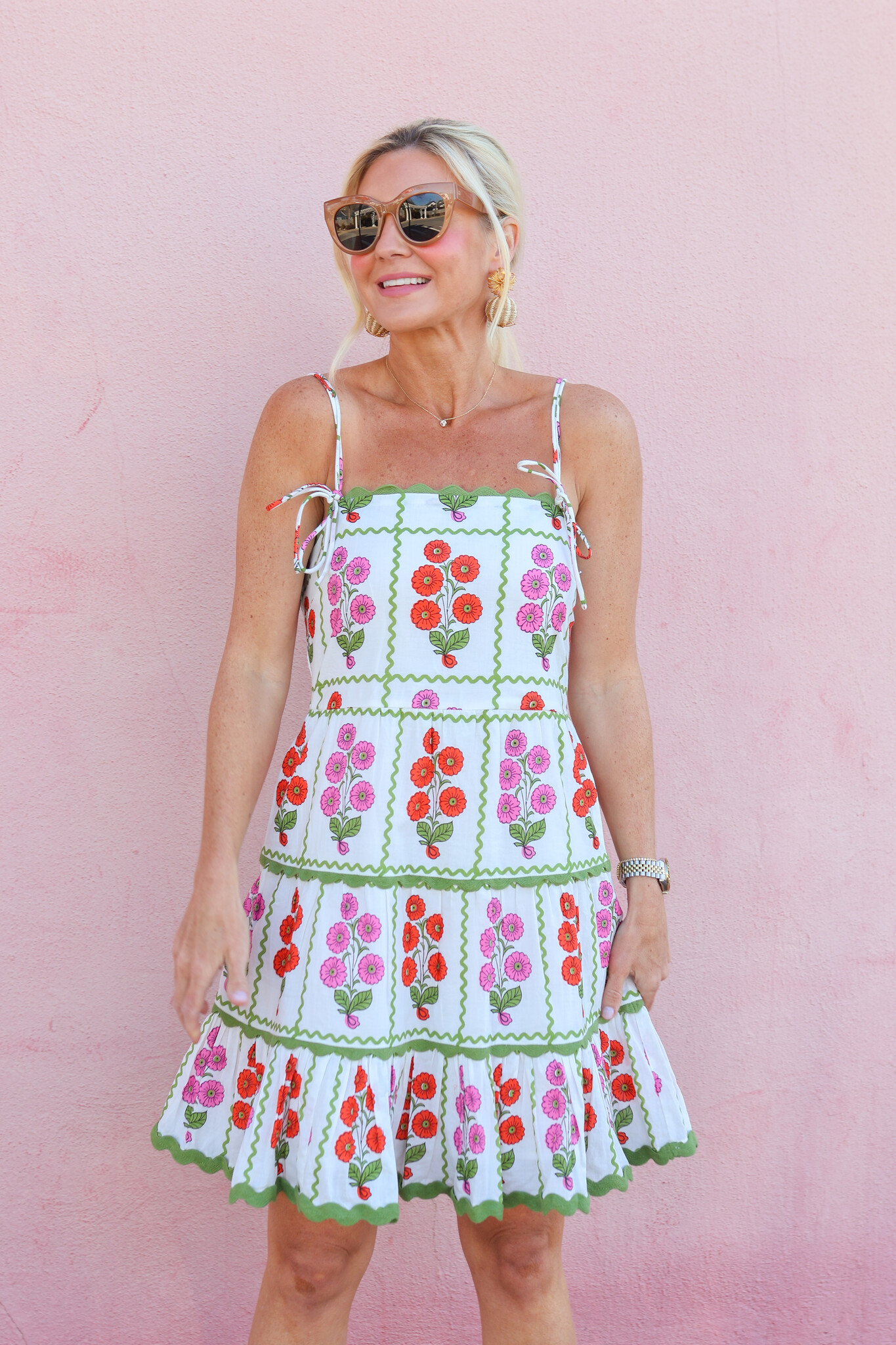 • Our Raphaela is cut from soft cotton with a pretty grid floral motif. The tank mini has a straight neckline, flirty skirt, and bow details on the straps. Finished with a ricrac trim along the neckline and hem, Raphaela packs an adorable punch!