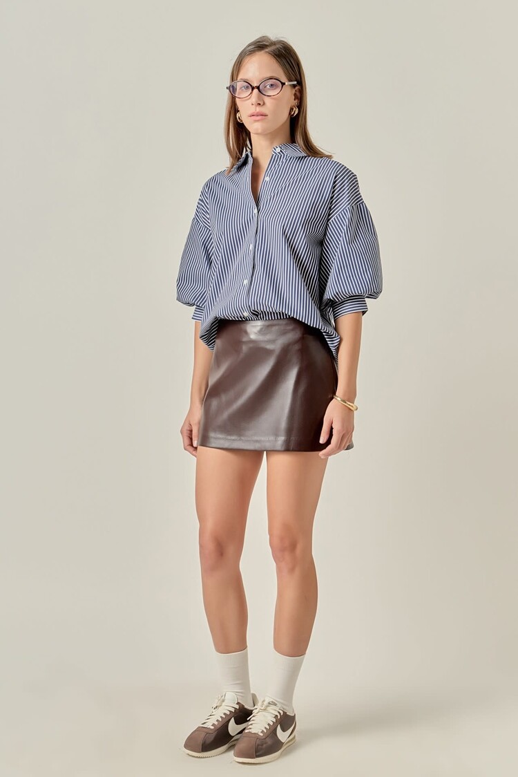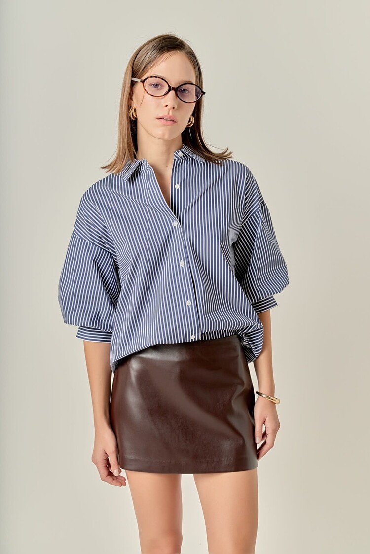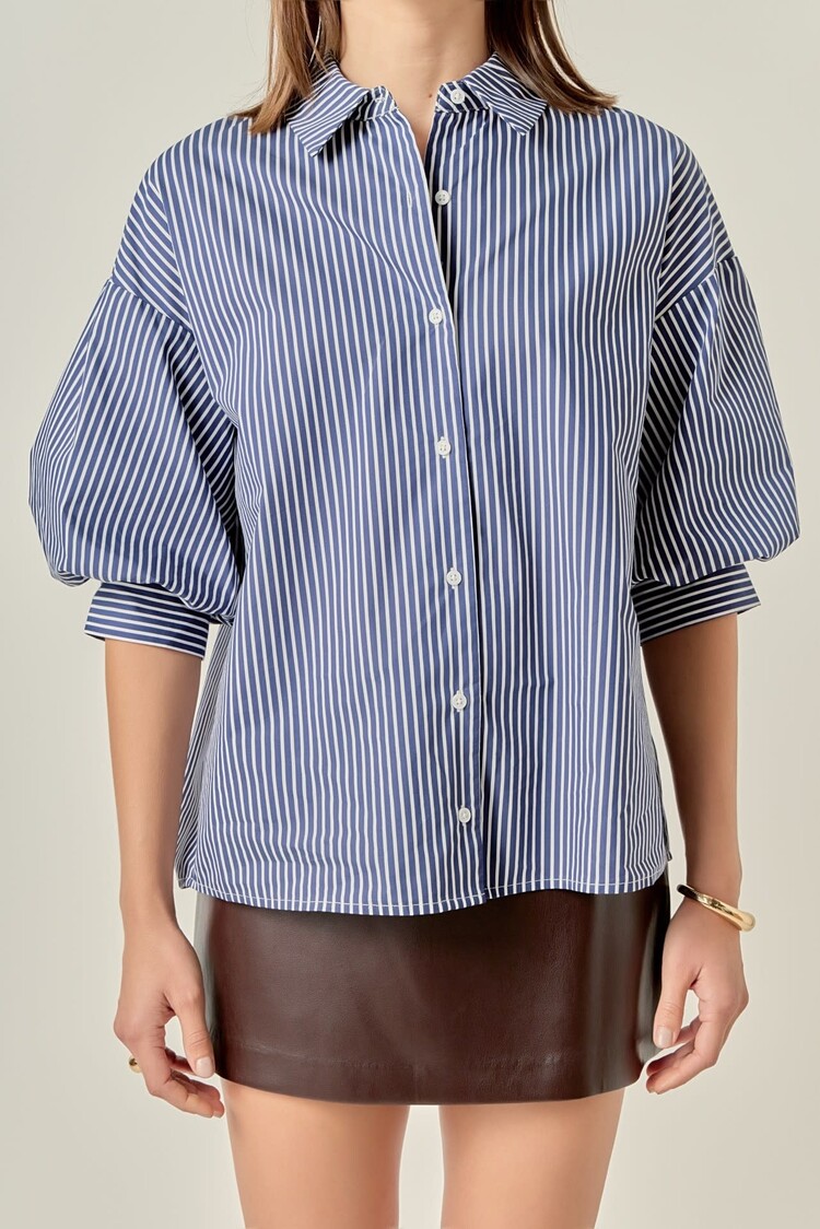 This elegant dress features timeless vertical stripes in a crisp color combination, offering a fresh and polished aesthetic. It is designed with a classic shirt collar, a full button-down front, and versatile long sleeves that can be styled up or down.