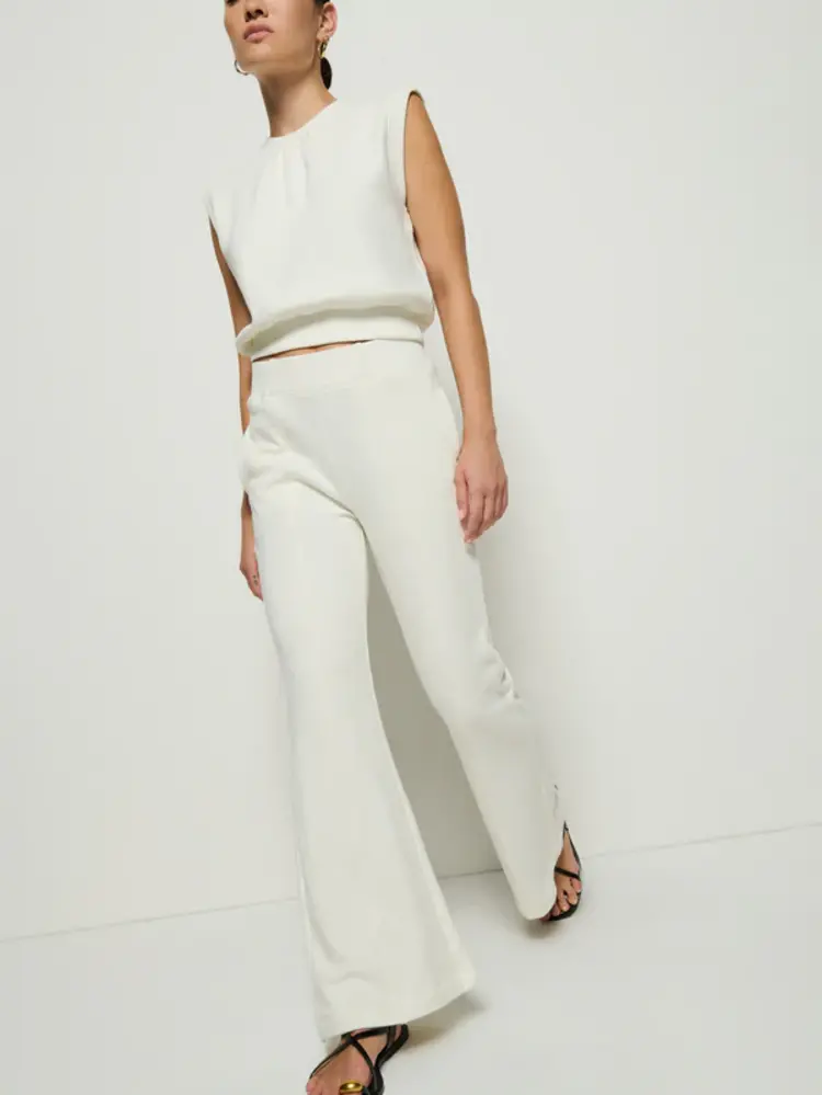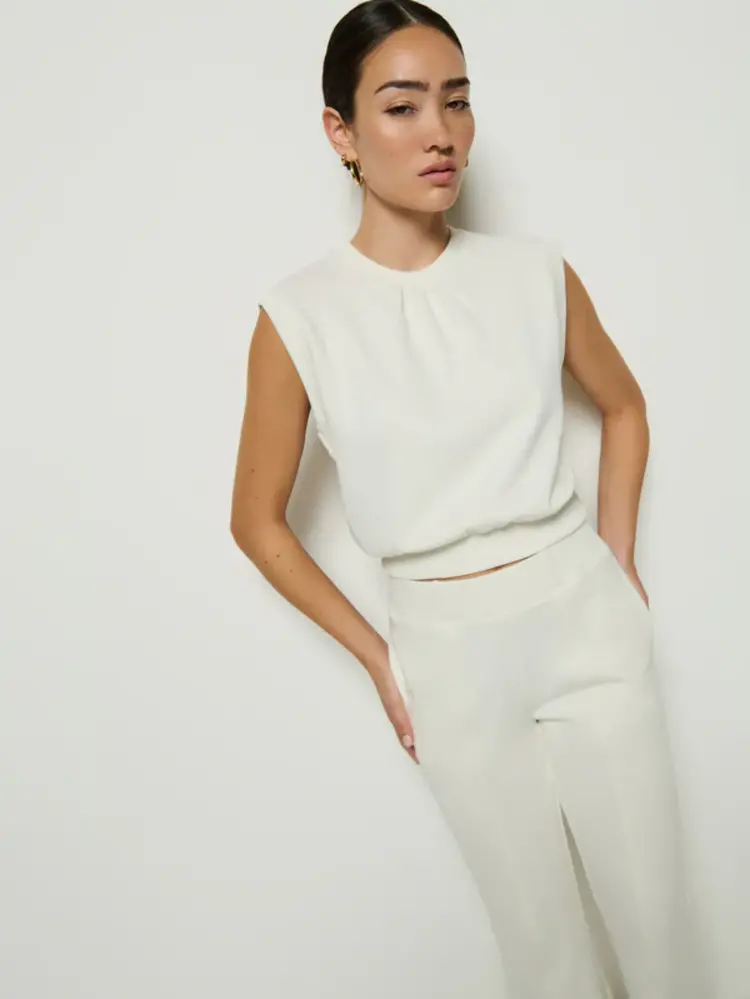 Contrast ribbing at the neck and armholes with a cropped, controlled hem, shirring at the neckline, and of course one of our signature gold buttons at the back. Style tip: pair with your favorite denim or make it a set with our Reece Sweatpant.