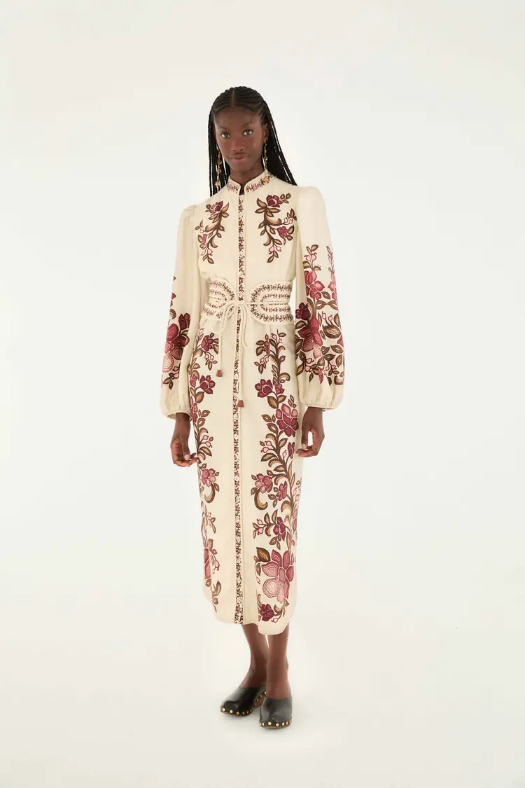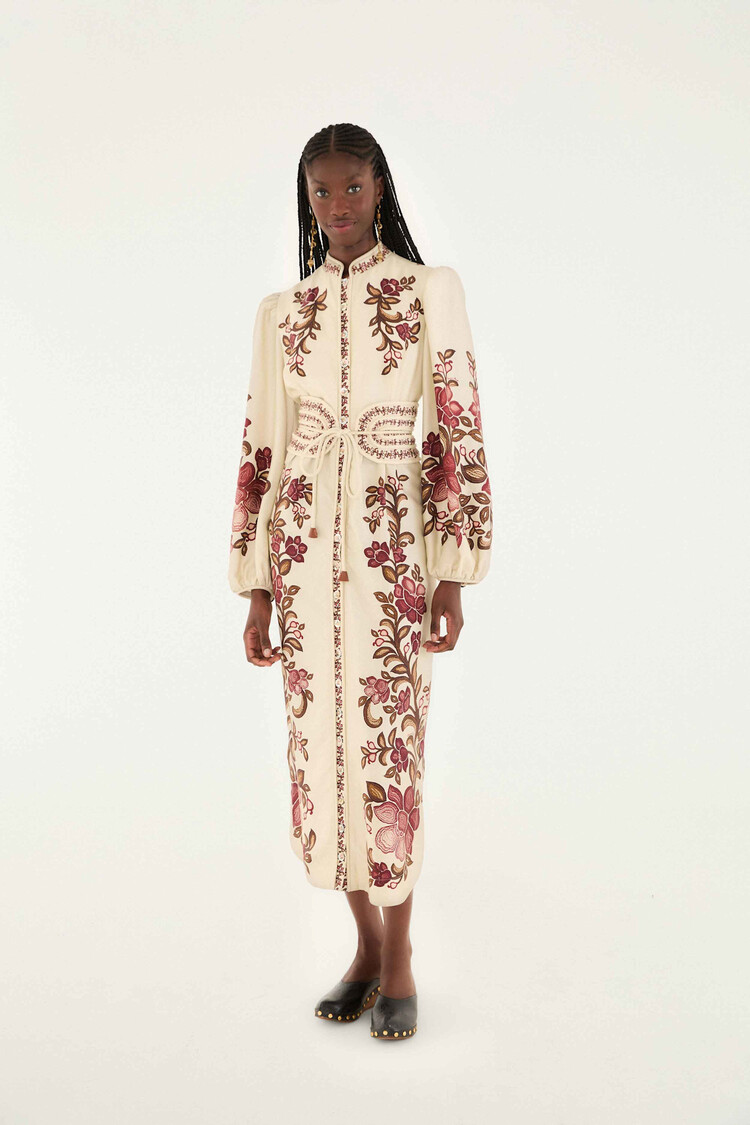 • Embrace a graceful flow with the Sand Renata Floral Long Sleeve Dress, featuring a high neckline that enhances its delicate silhouette. This dress blooms with intricate floral patterns in warm rose, burgundy, and earthy tones, layered in a fluid shape.