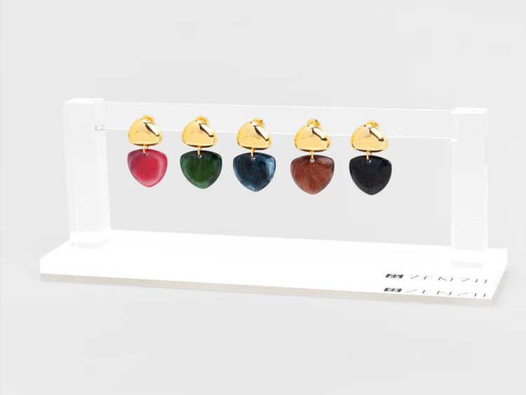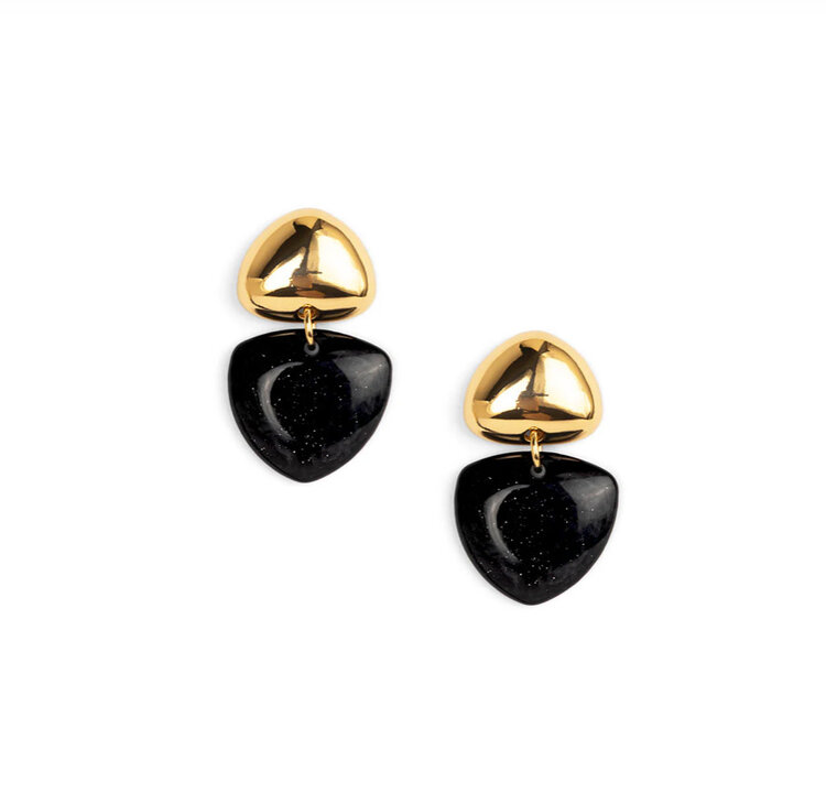 • Glossy gold-tone hardware meets a marbled resin triangle for a sleek, sculptural silhouette.