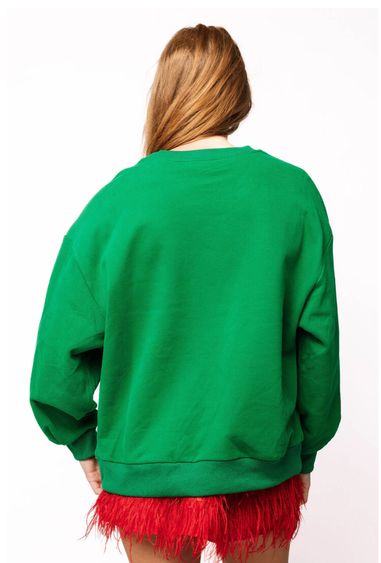 Bring festive cheer to your wardrobe with this playful oversized sweatshirt, sparkling with rhinestones that spell out "Merry & Bright." Cozy and eye-catching, it’s the perfect holiday top to keep you comfortable & spread joyful vibes all season long.