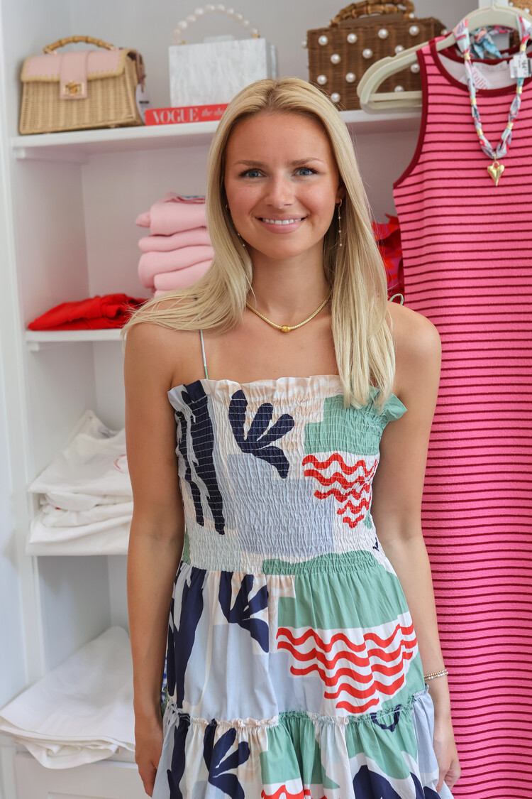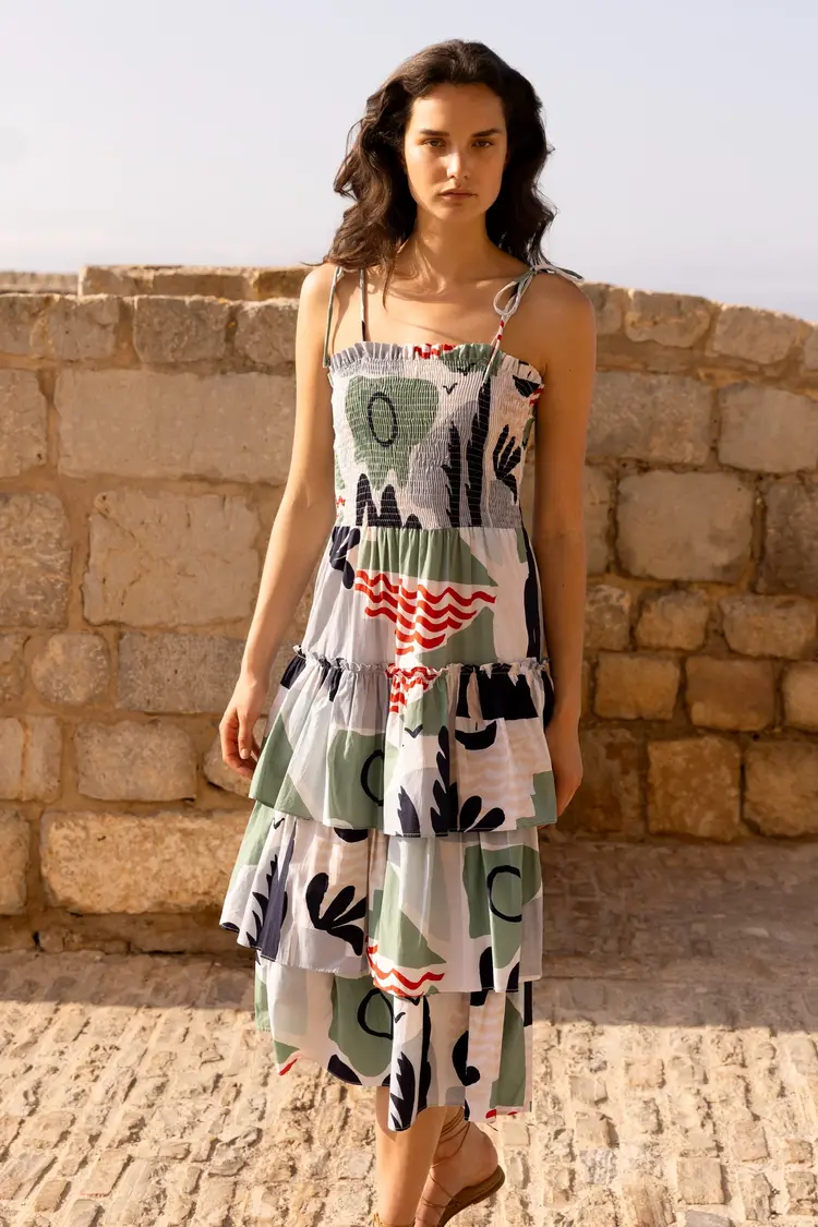 • A dress that deserves to be seen! Serene scenes of the French Riviera compliment the smocking that comfortably hugs your bodice. The tiered ruffle skirt adds fun movement and volume.