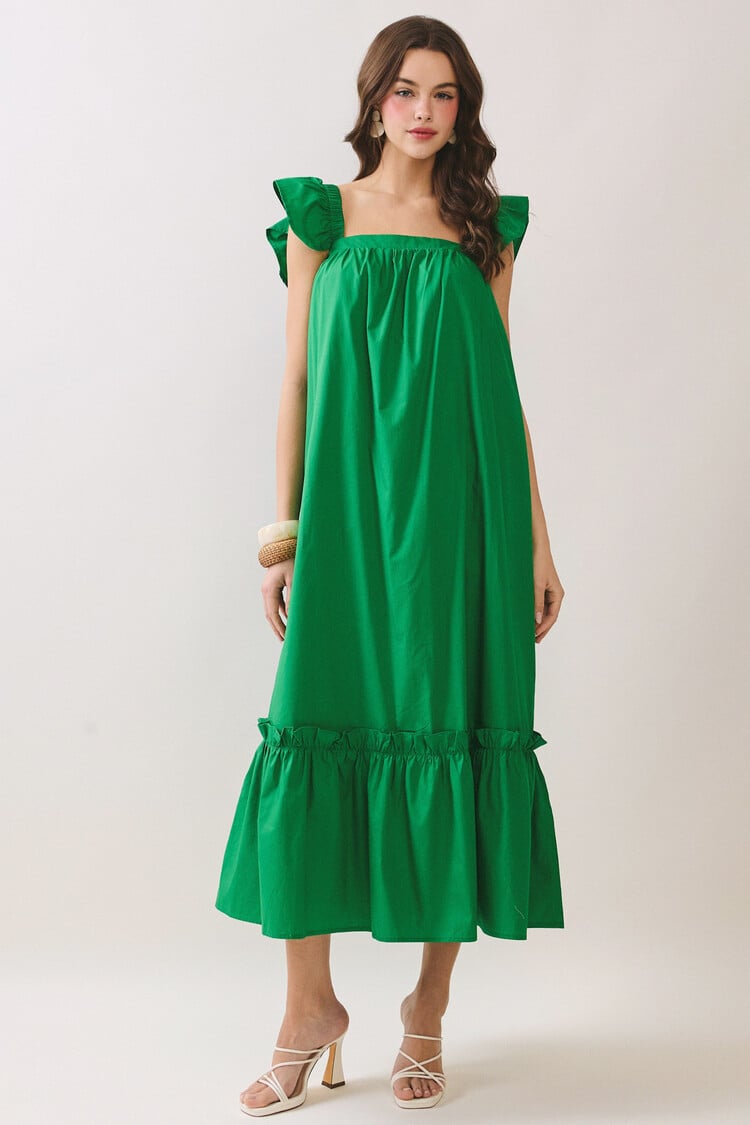 A solid midi dress featuring ruffled cap sleeves and a soft, relaxed silhouette. Designed with a square neckline and an elasticized back for added comfort. Finished with a tiered ruffle hem. 100% cotton