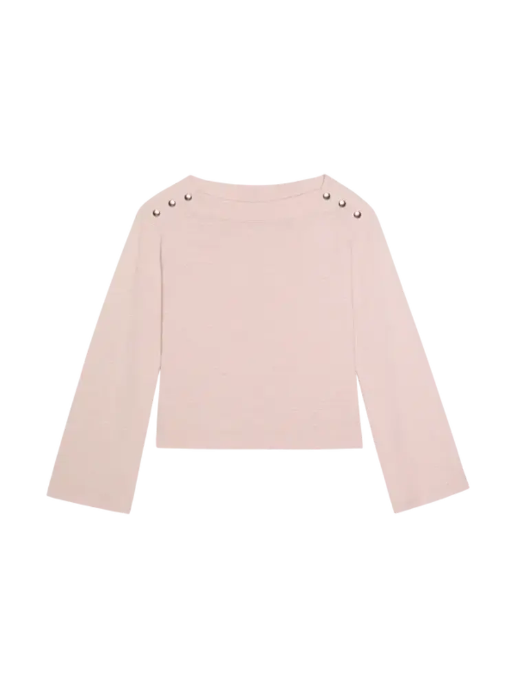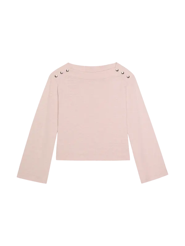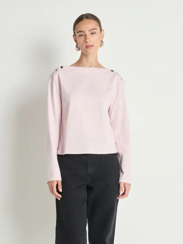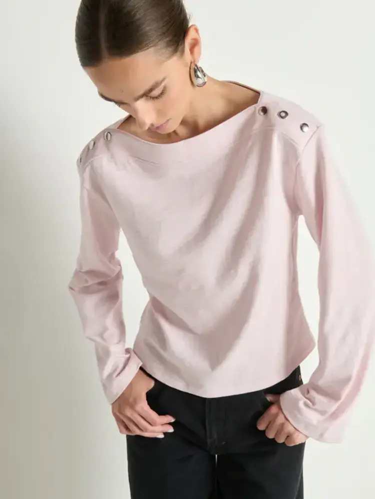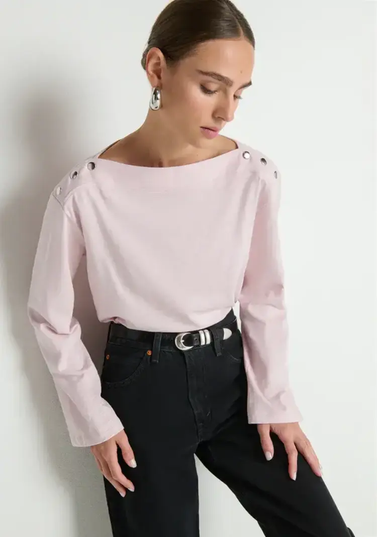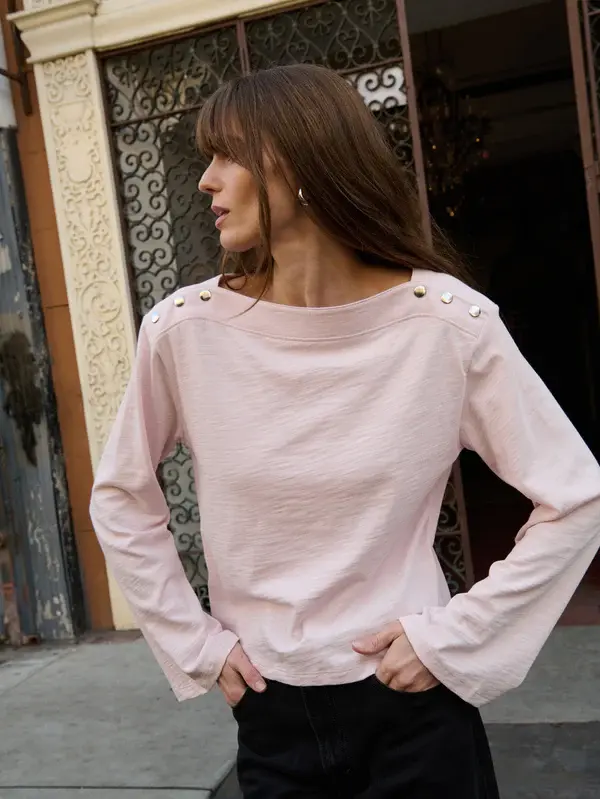 • The Rochelle Boatneck Tee brings a refined, dress-up feel while still staying cool and approachable. Boxy, soft, and easy to wear, it’s finished with bell sleeves, a clean boat neckline, and subtle silver snaps for just the right amount of character.
