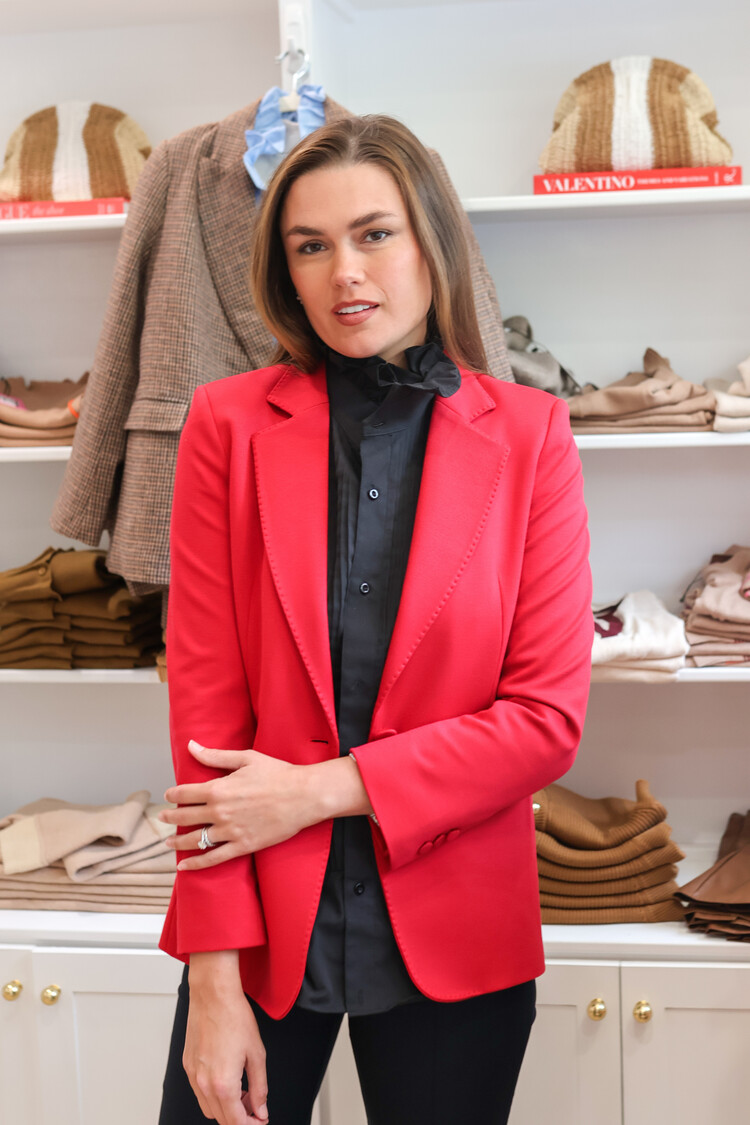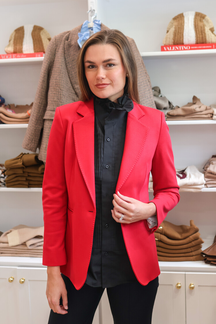 • Red jacket with a straight cut and one-button closure at the front. Classic lapel with visible stitching and matching fabric-covered buttons on the cuffs. Printed inner lining with illustrated motifs.