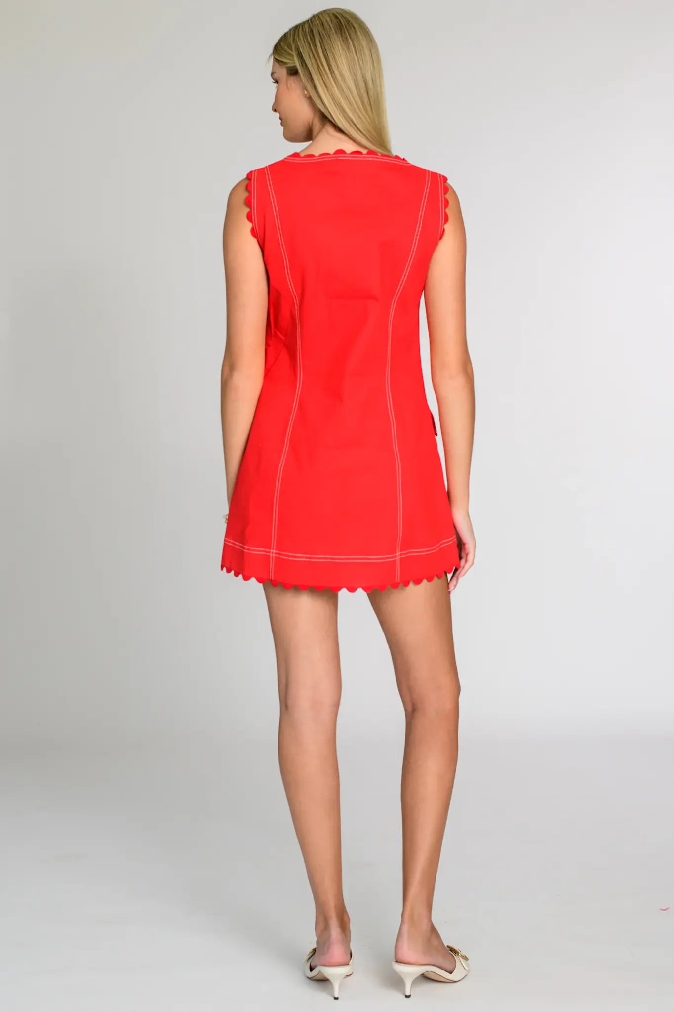 • Rory is all the rage this season, especially in this poppy red stretch twill fabric. She has the silhouette of a shift dress with a button front, welt pockets, ric rac trim, and white stitching accents.