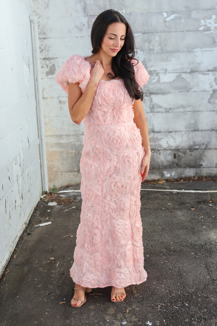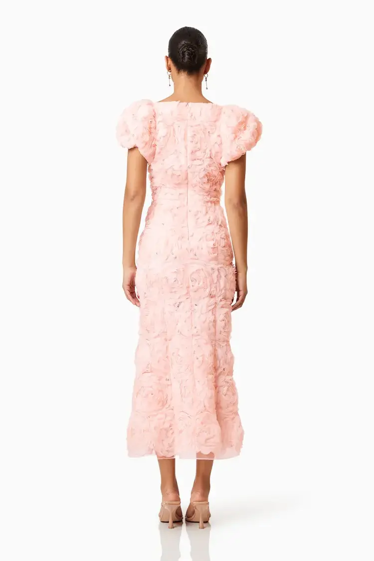 • Featuring a stunning puff sleeve design, this midi dress is made to make a statement. The dress is designed with a kick flare silhouette skirt, creating a flattering shape that moves beautifully with every step.