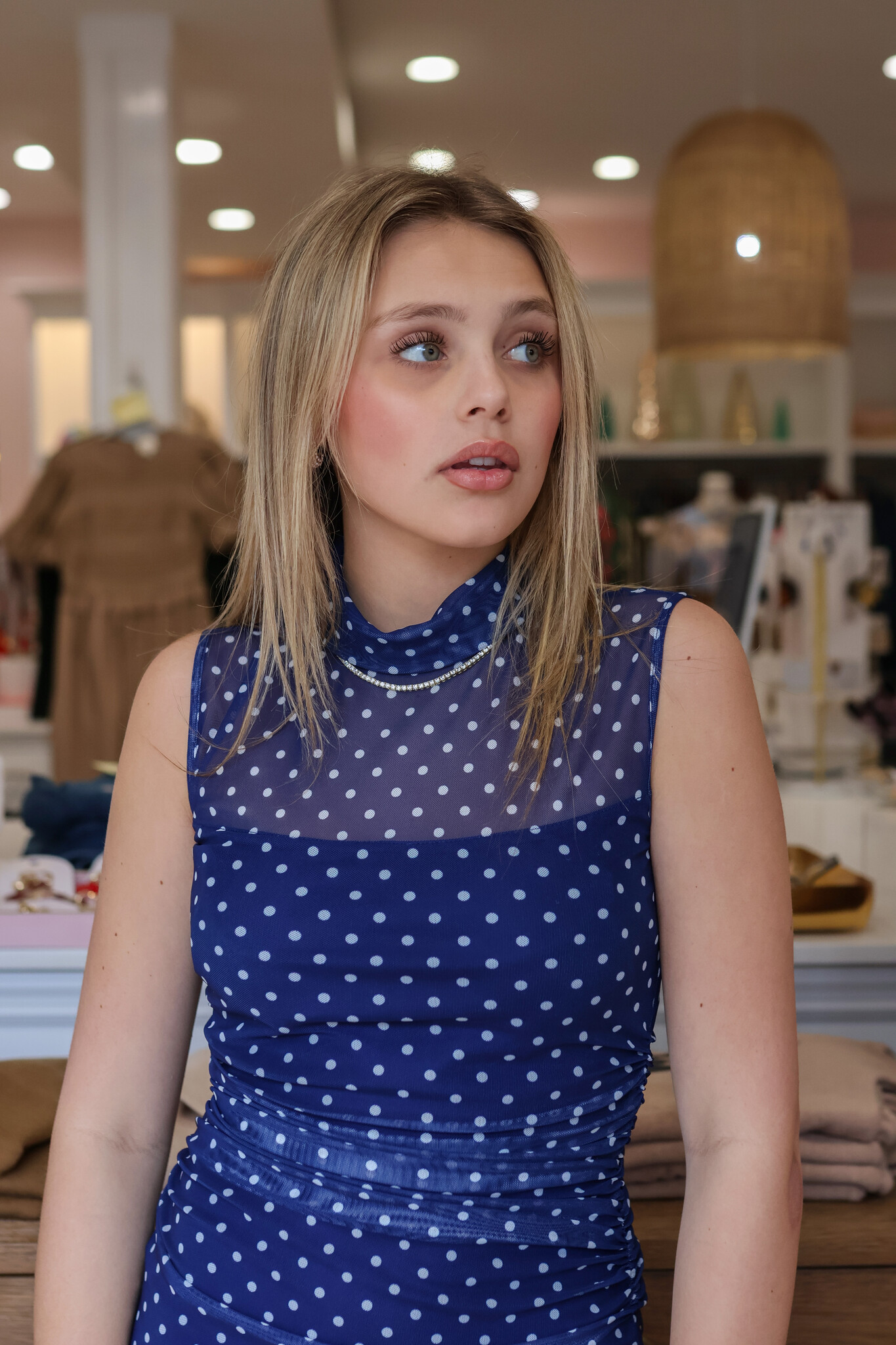 • Make your night a little more fun in the Rumi Sleeveless Dress. With a drop waist, gathered skirt, and sheer neckline, this mock-neck mini balances bold confidence with a playful touch. Add colorful heels to bring an extra pop of energy.