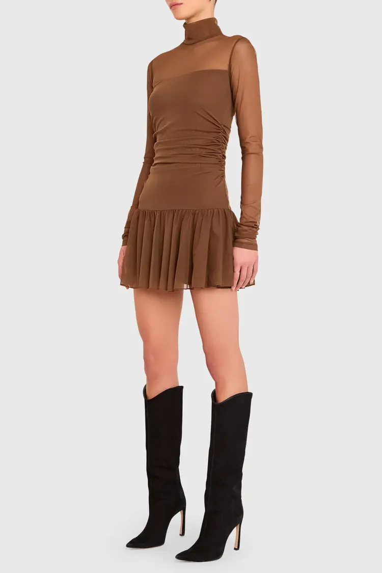 • Make your move in the Rumi Dress. With a drop waist, gathered skirt, and sheer long sleeves, this mock neck mini balances bold confidence with a romantic touch. Pair with tall boots for a strong finish.